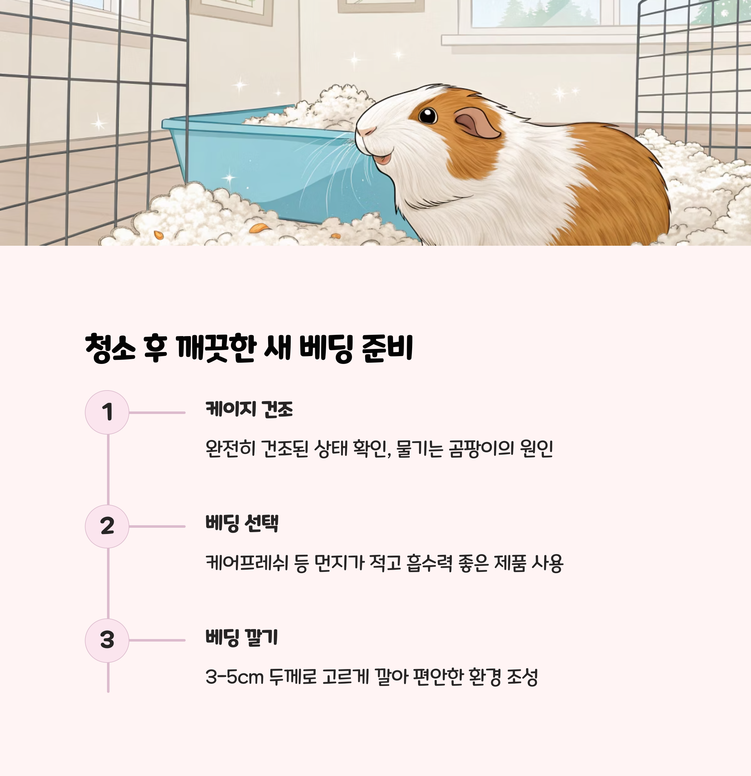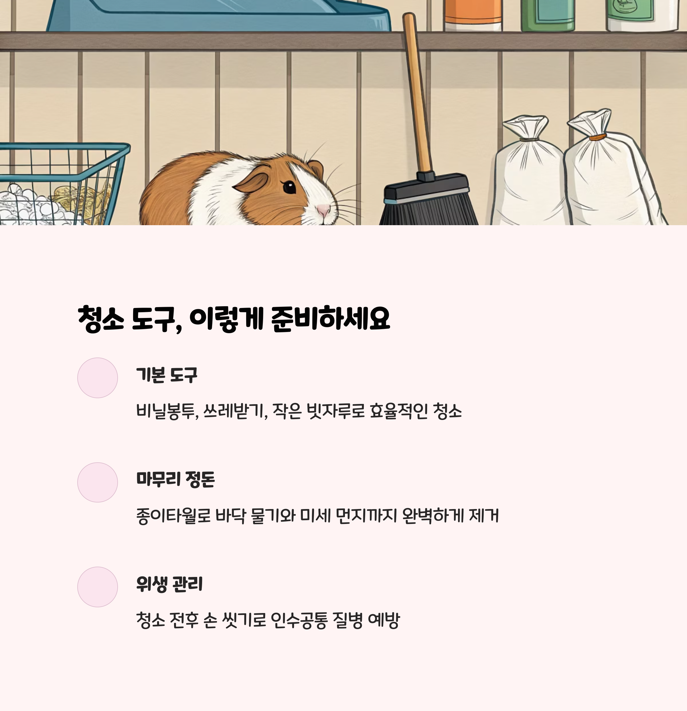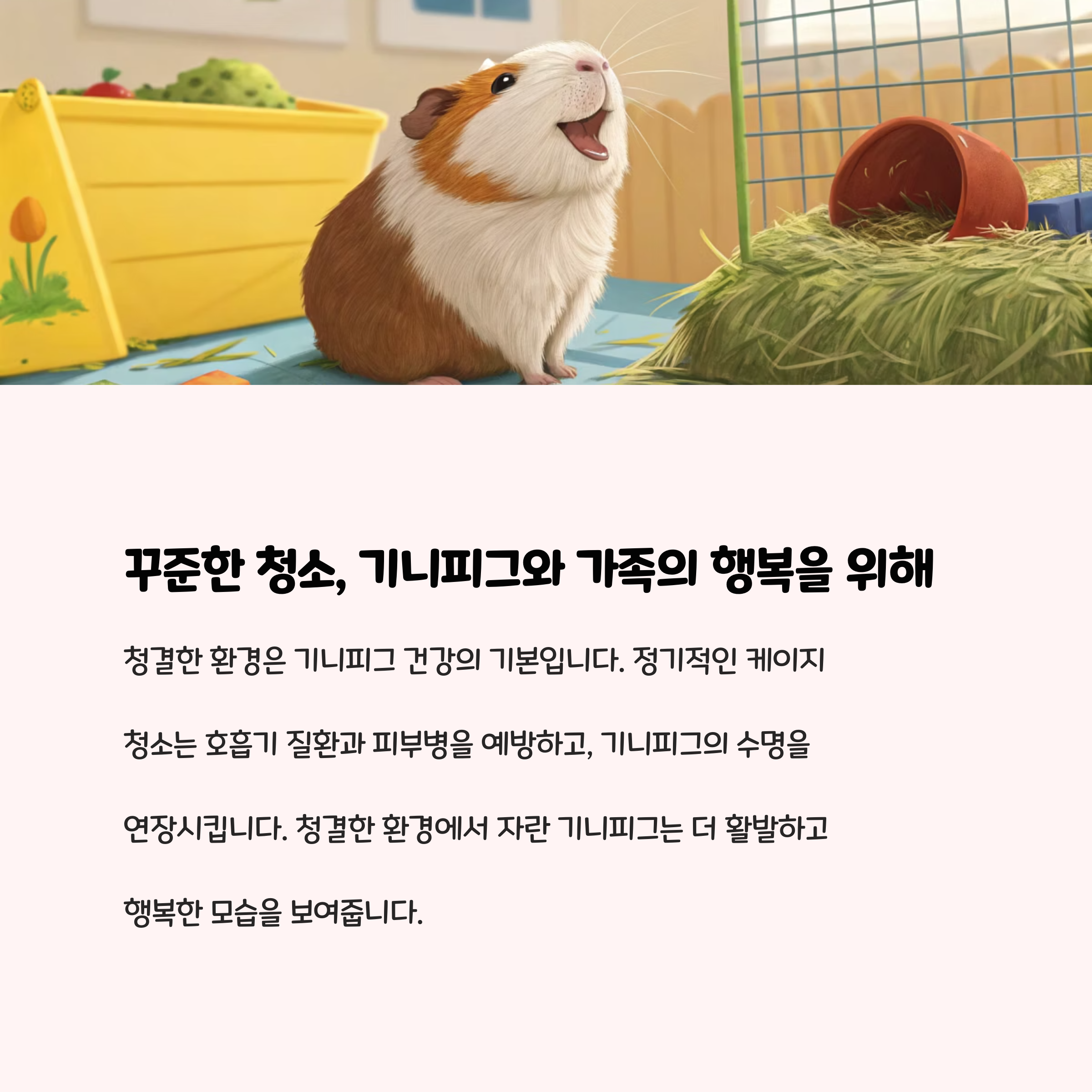 기니피그의 건강과 가족의 쾌적한 생활을 위해 매일의 작은 청소 습관이 가장 강력한 해결책입니다. 오늘 안내드린 체계적인 케이지 청소법과 위생 관리 노하우로, 여러분의 기니피그가 더 건강하고 행복하게 지낼 수 있길 바랍니다.