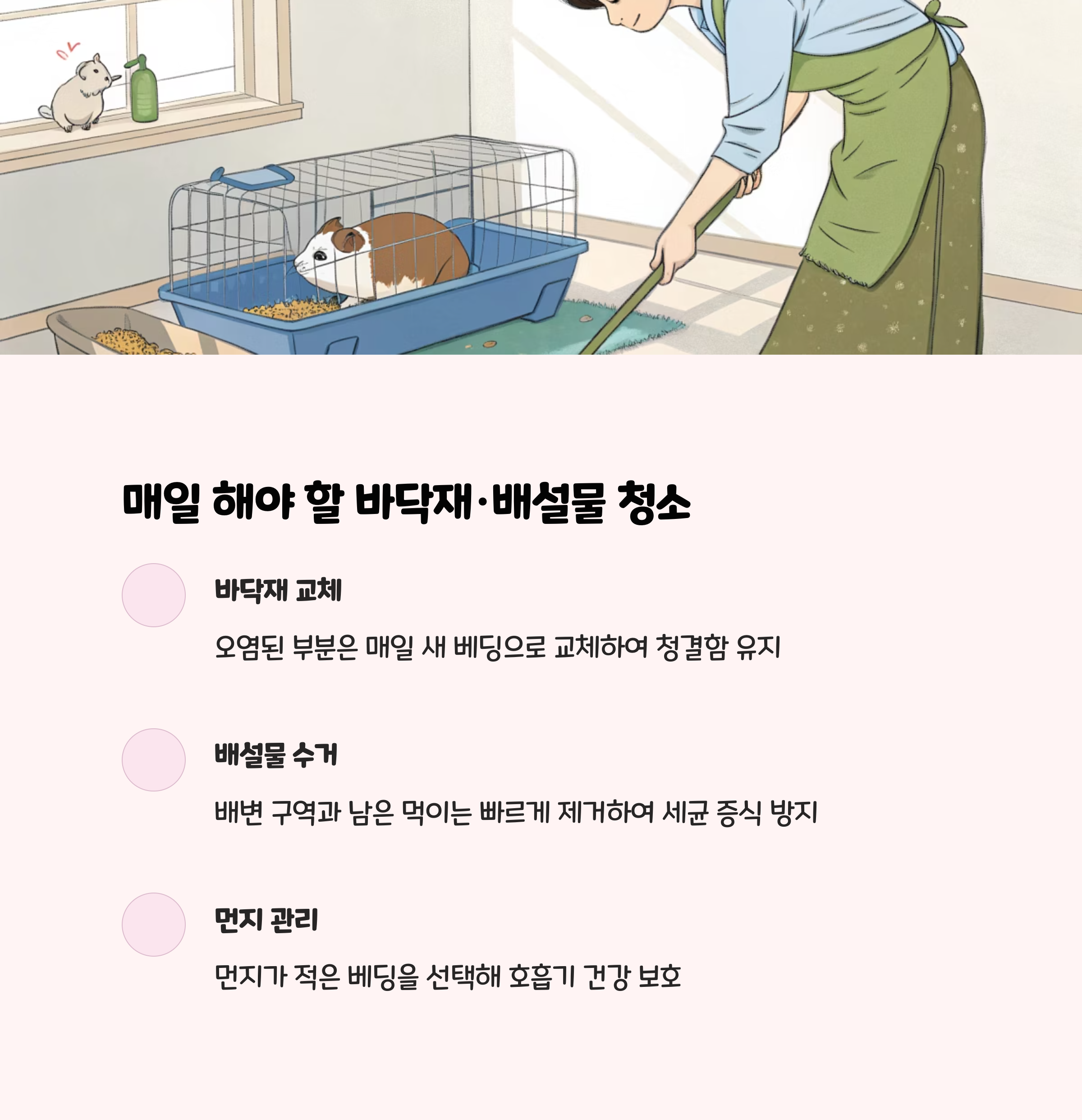 - 종이베딩, 우드베딩, 톱밥 등 바닥재는 최소 하루 1회 교체가 권장됩니다.