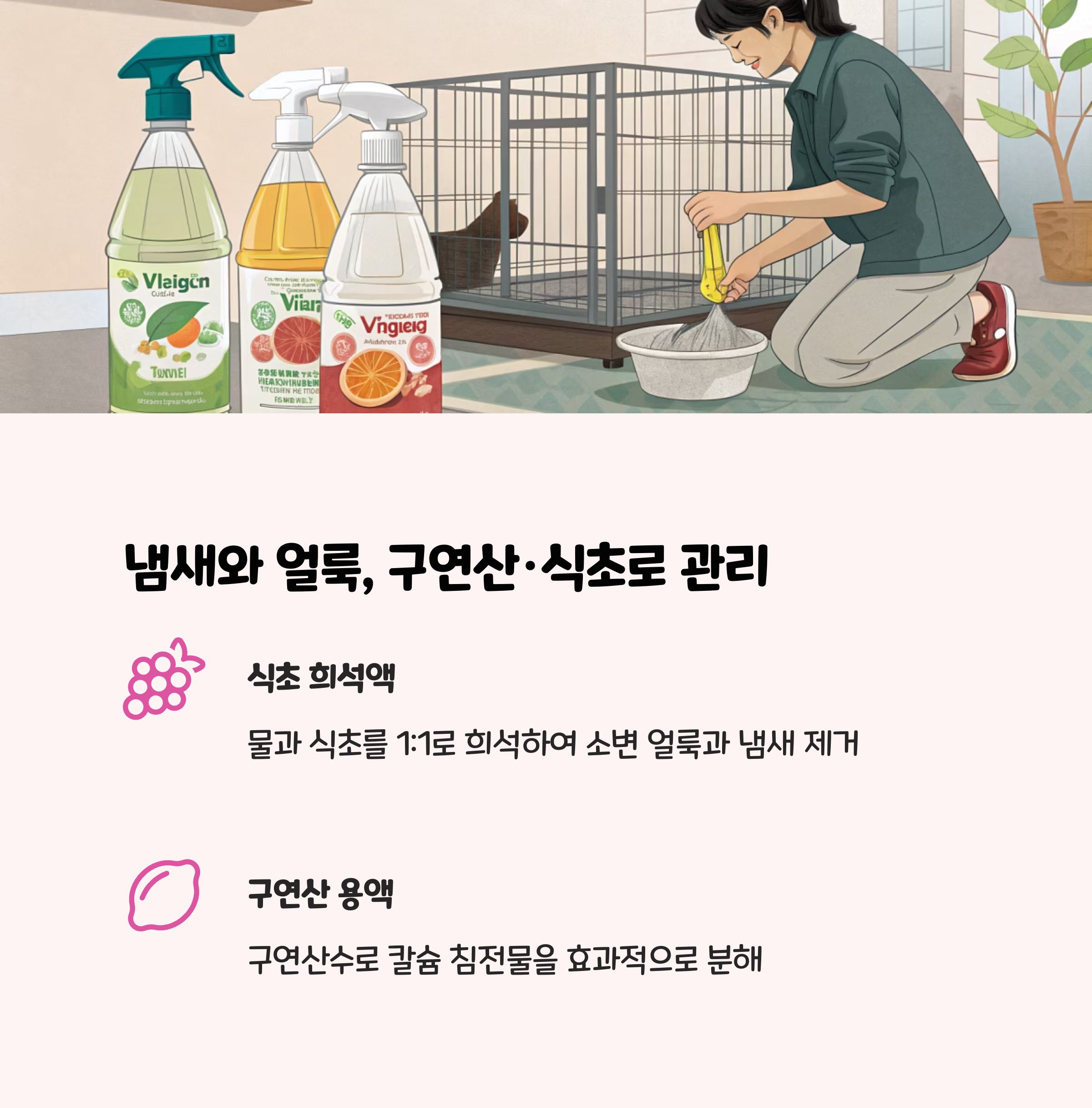 - 식초와 물을 1:1로 섞어 바닥과 벽면을 닦으면 살균과 탈취에 효과적입니다. 청소 후에는 반드시 깨끗이 닦고 완전히 건조시켜야 합니다.