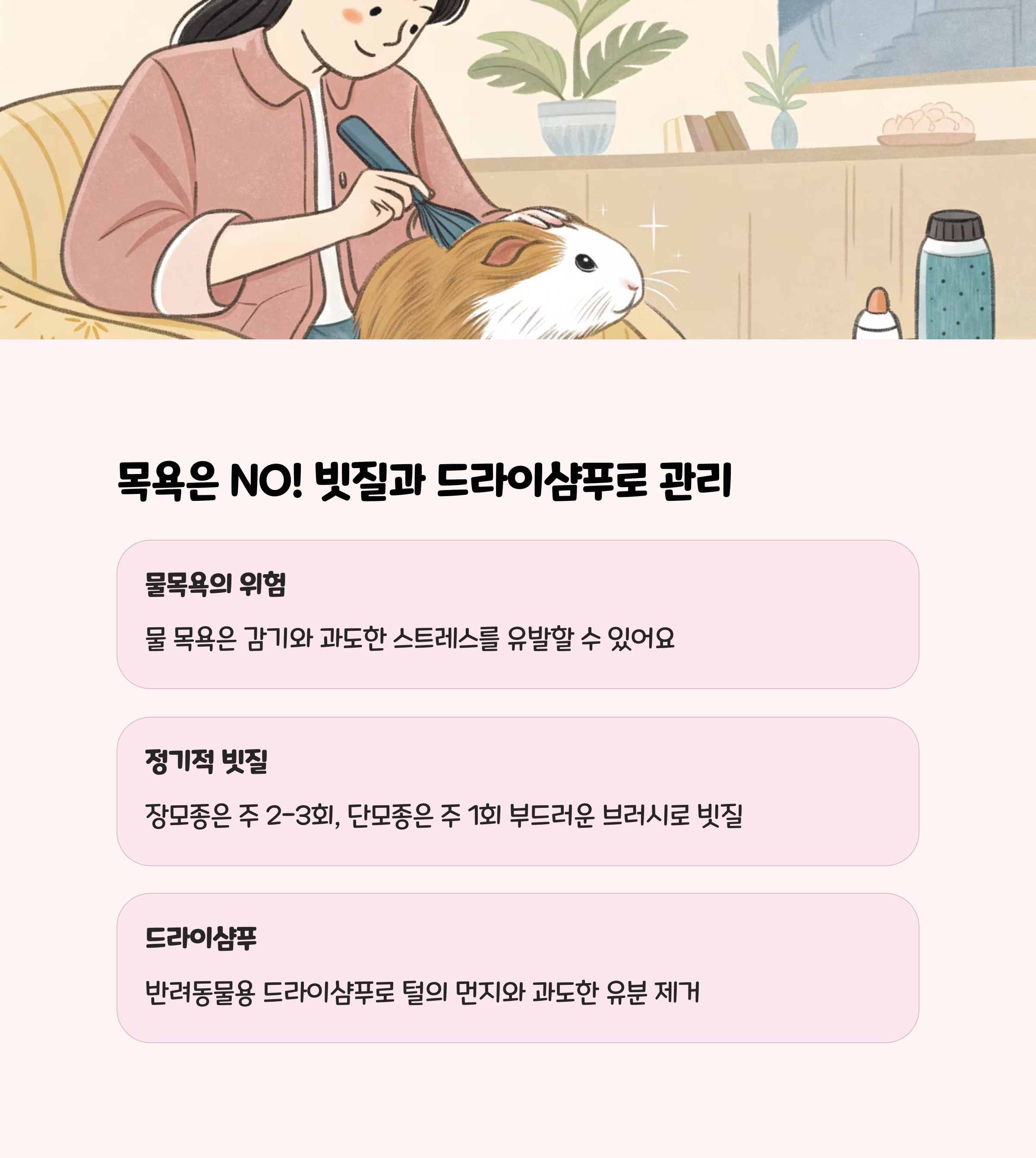기니피그는 목욕을 자주 시키지 않는 것이 원칙입니다. 대신 주 2~3회 빗질로 죽은 털을 제거하고, 오염된 부분은 반려동물 전용 물티슈나 드라이샴푸로 닦아줍니다.