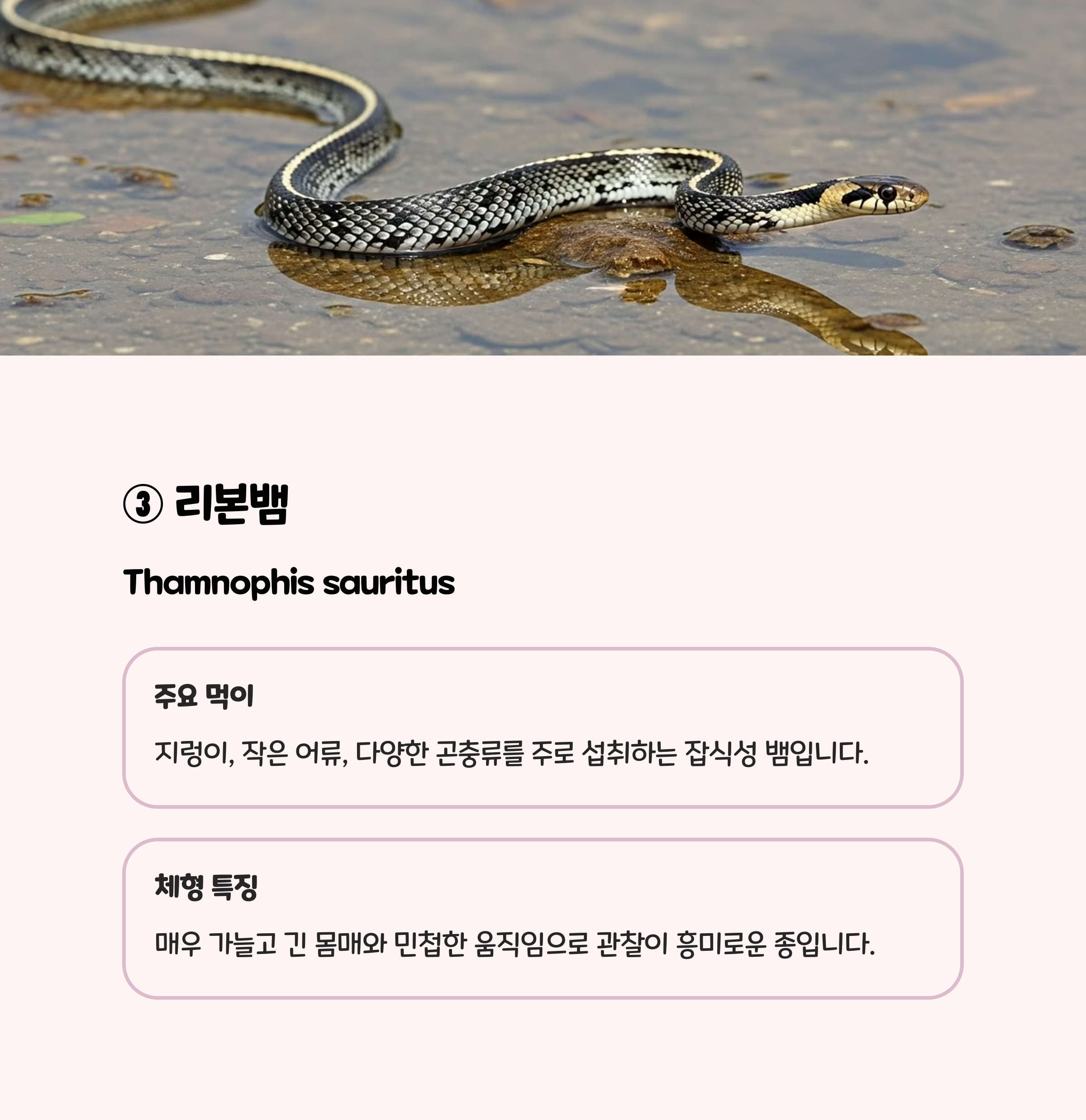 | Thamnophis sauritus | 리본뱀 | 40~89cm | 소형 어류, 곤충, 양서류 |