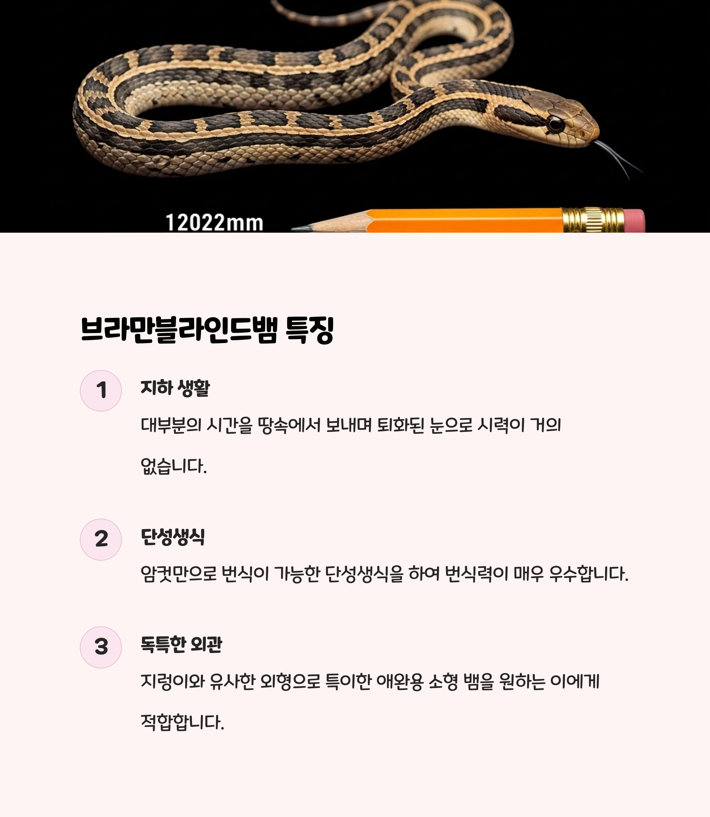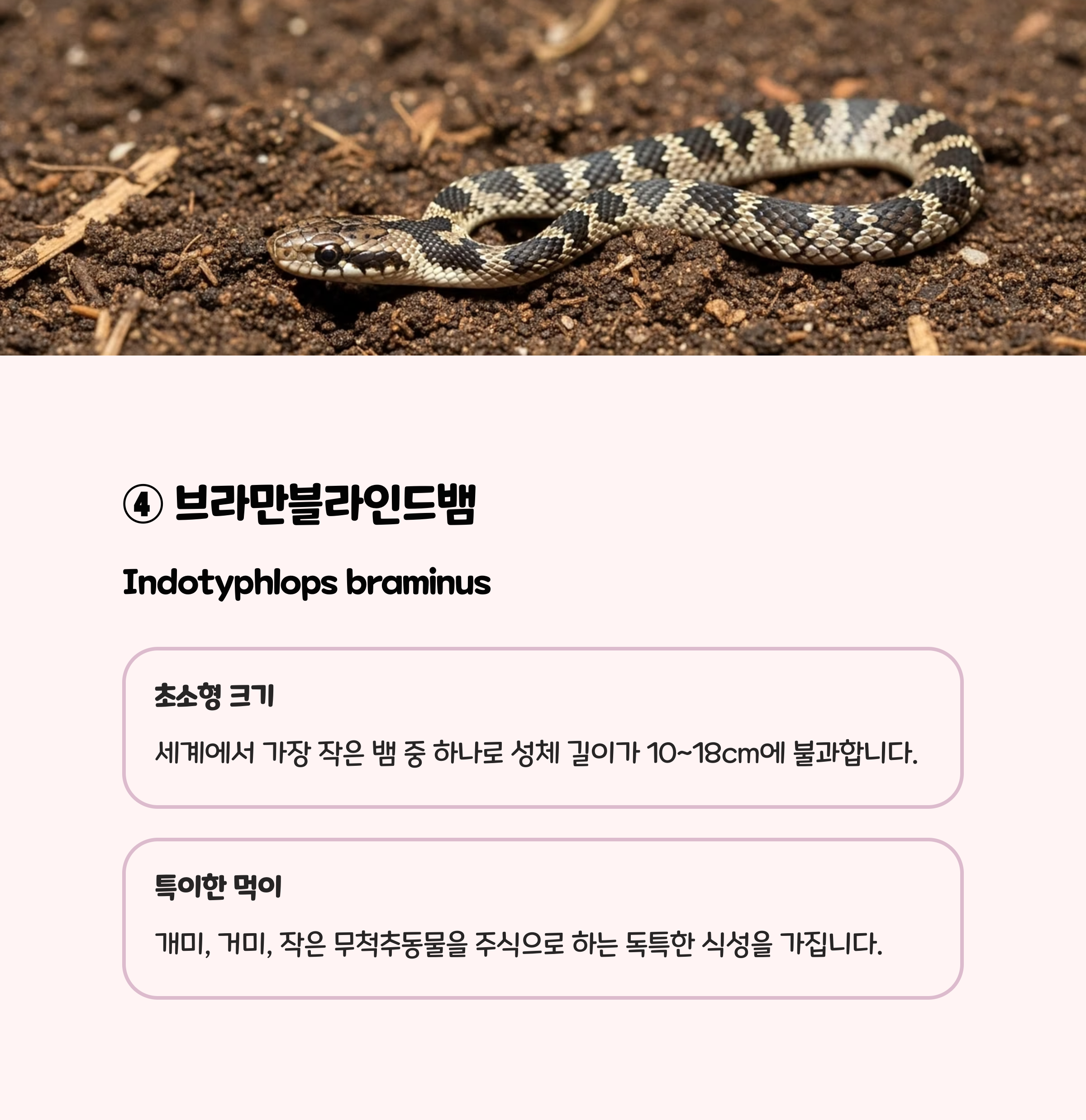 | Indotyphlops braminus | 브라만 블라인드뱀 | 10~18cm | 개미, 흰개미, 곤충 유충 |