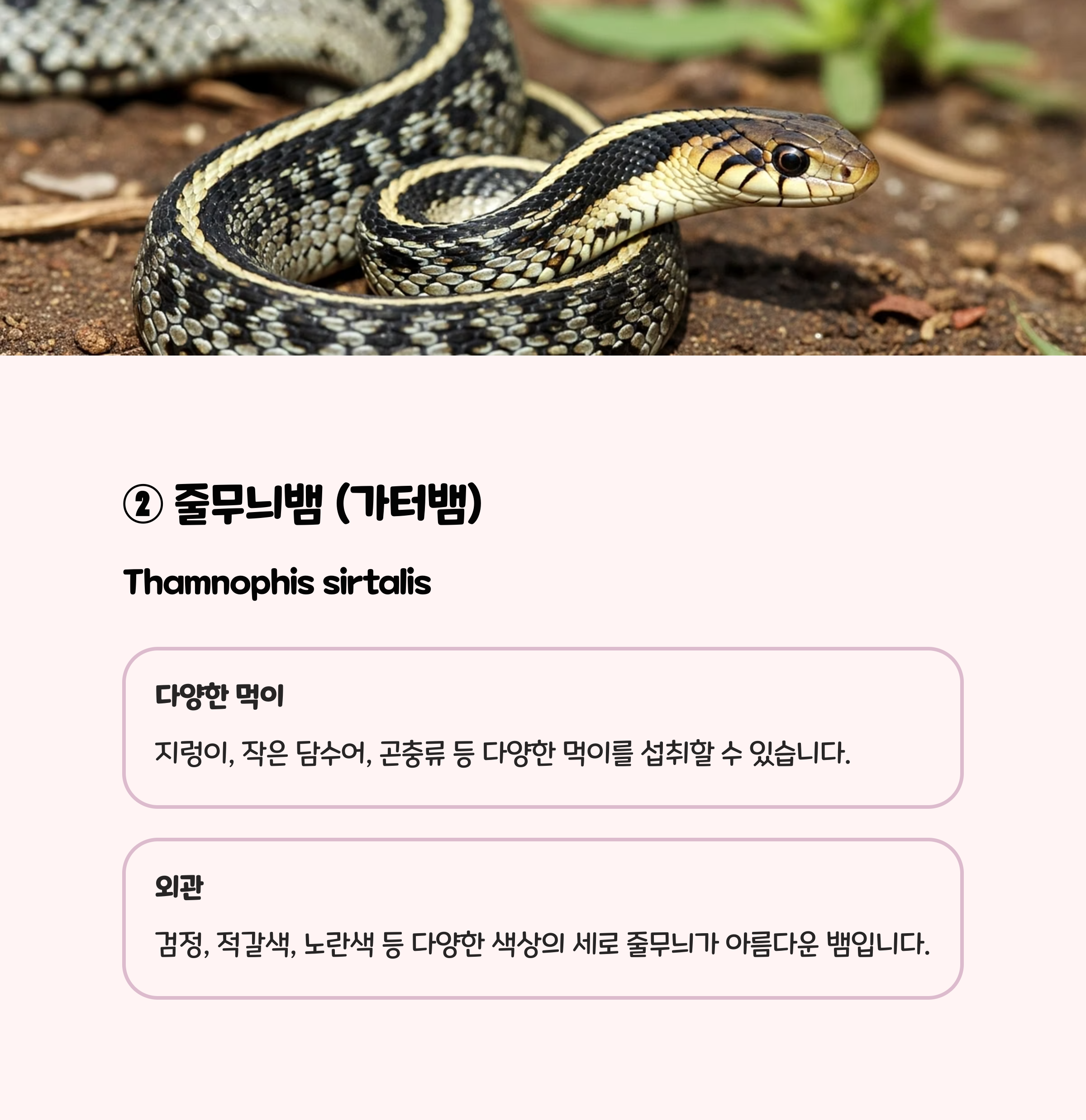 | Thamnophis sirtalis | 줄무늬뱀 | 50~80cm | 지렁이, 소형 어류, 곤충 |