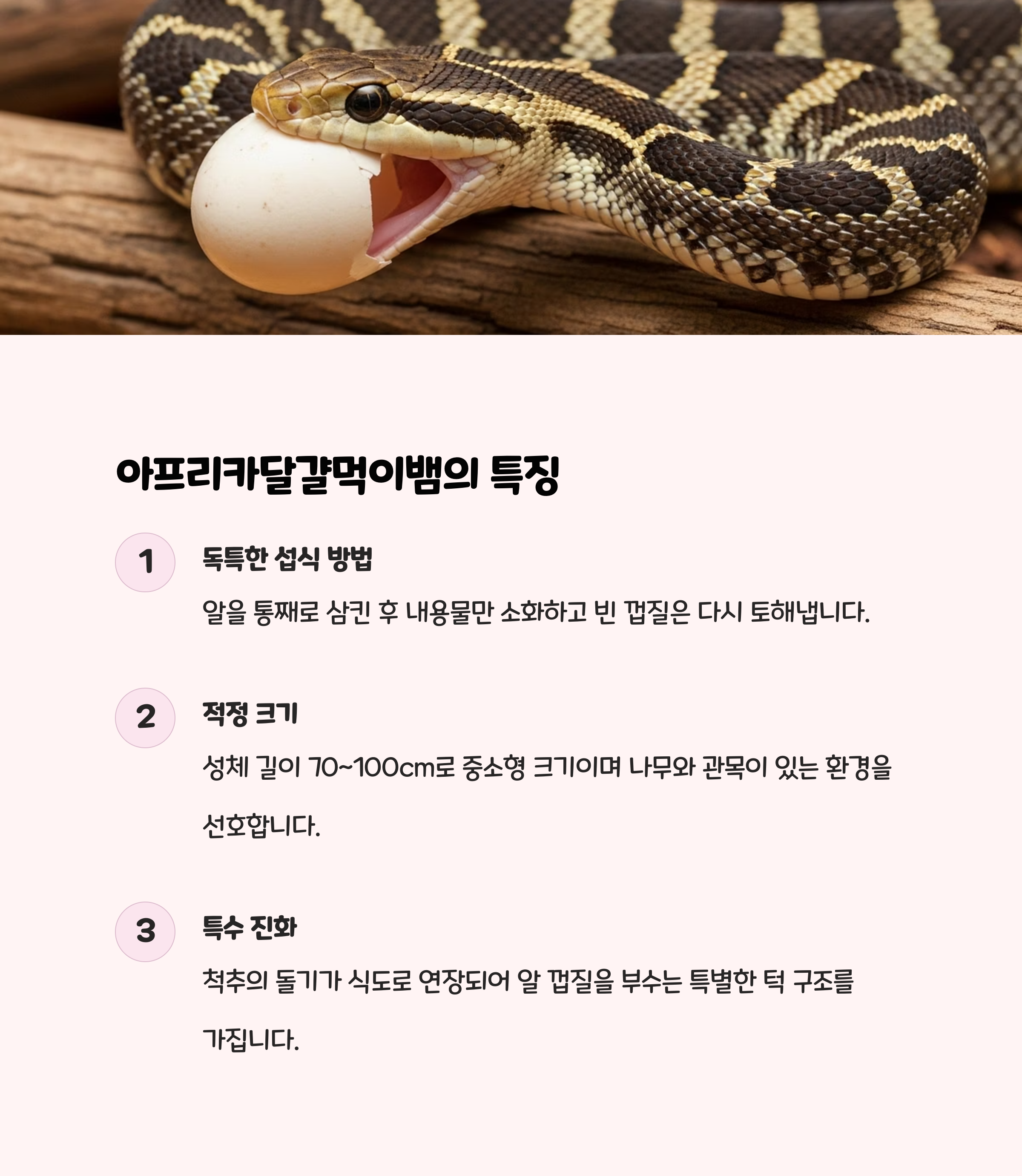 아프리카달걀먹이뱀과 줄무늬뱀은 성격이 온순하고 먹이도 대체적으로 구하기 쉬워 초보자에게 추천되는 종입니다.