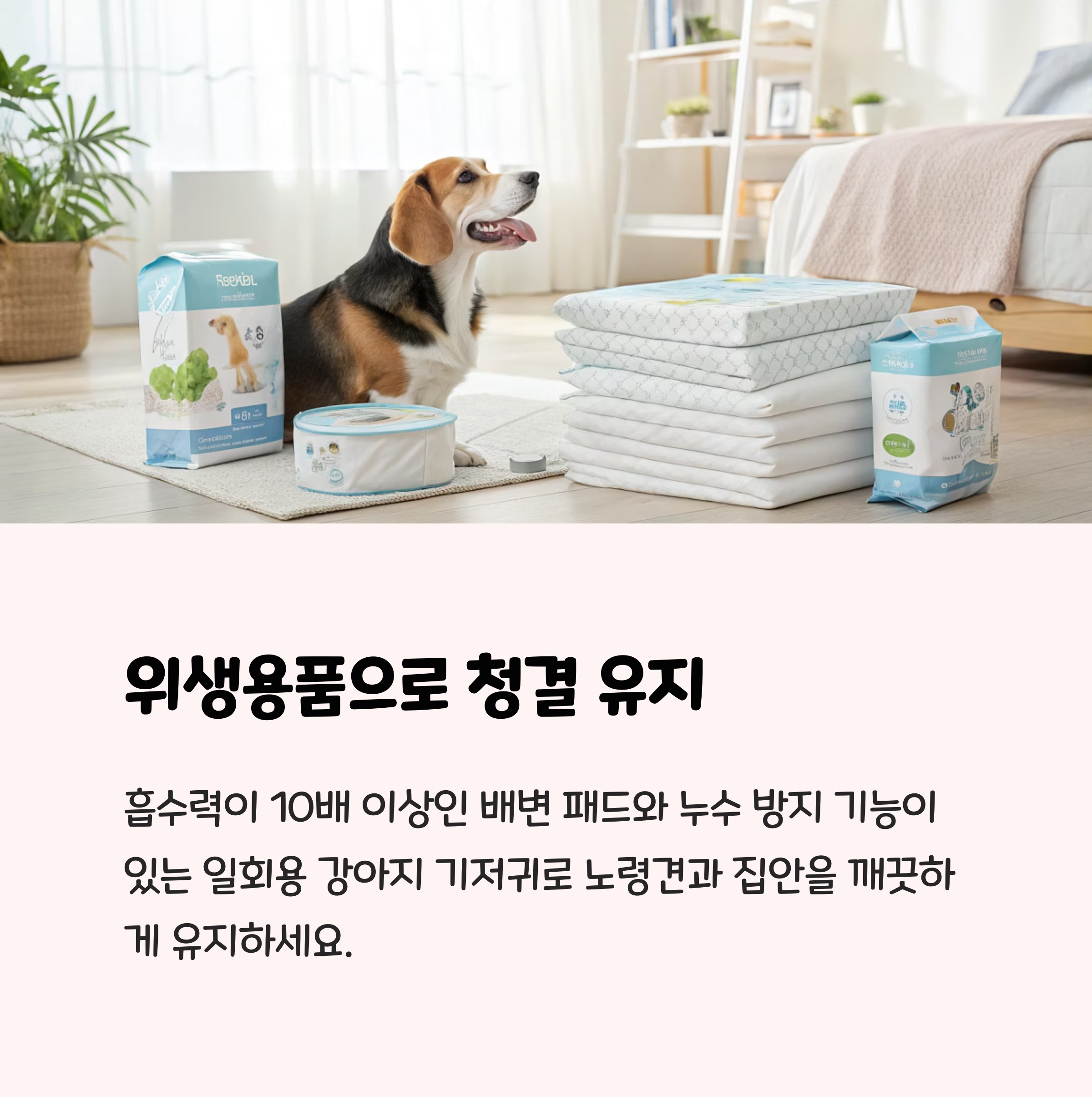 노령견은 배변 조절 능력이 떨어질 수 있어 기저귀, 배변 패드 등 위생 관리용품이 필수입니다. 배변 패드는 강아지의 주 생활공간 가까이에 배치해 접근성을 높여주는 것이 좋습니다.