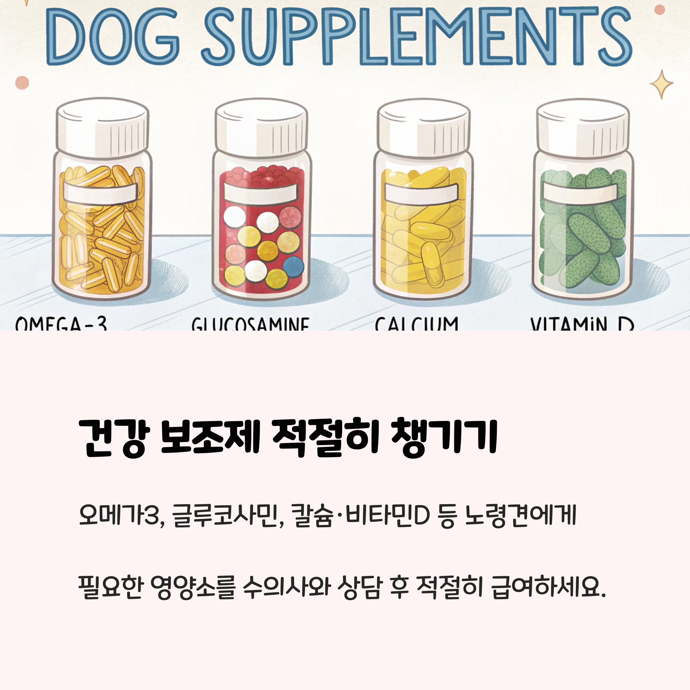 노령견은 소화기능 저하와 면역력 약화가 흔하므로, 수의사 처방에 따른 영양제와 노령견 전용 처방 사료를 급여하는 것이 건강 유지에 필수적입니다. 특히 관절 건강을 위한 글루코사민, 콘드로이틴 성분이 포함된 보조제가 도움이 됩니다.