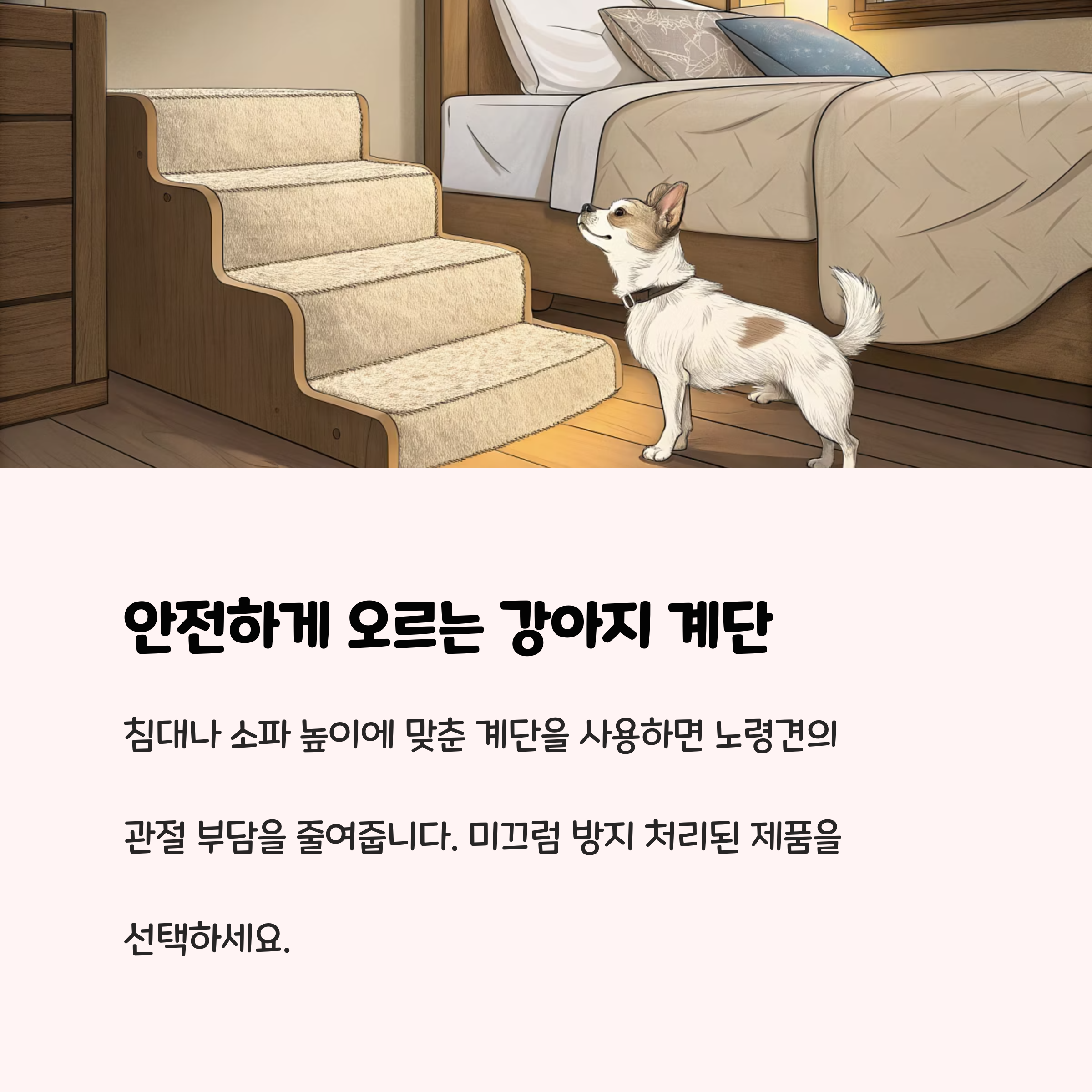 노령견은 관절과 근육이 약해져서 미끄러운 바닥에서 쉽게 넘어질 위험이 큽니다. 따라서 거실, 복도, 자주 다니는 동선에는 미끄럼 방지 매트나 카펫을 깔아주어 낙상 사고를 예방해야 합니다. 특히 대리석이나 타일 바닥은 미끄러움이 심하므로 꼭 대비가 필요합니다. 또한, 소파나 침대, 자동차에 오르내릴 때 뛰어내리는 행동은 관절에 큰 부담을 주므로, 강아지 전용 계단이나 경사로(램프)를 설치해 부드럽고 안전하게 이동할 수 있도록 도와주는 것이 좋습니다. 위험한 계단 주변은 안전문으로 차단해 사고를 방지하세요.