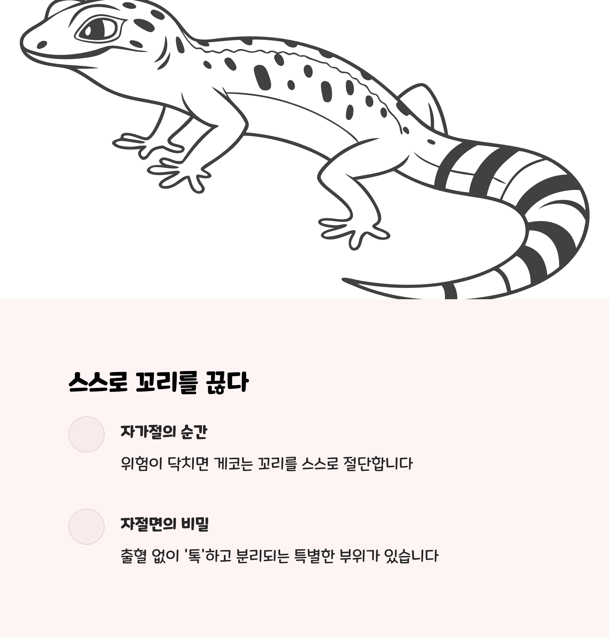 꼬리 자절은 게코가 위협을 받을 때 자신의 꼬리를 자발적으로 절단하는 생존 본능으로, 꼬리 절단 후에도 일정 시간 꿈틀거리며 포식자의 시선을 분산시켜 도망갈 시간을 확보합니다.