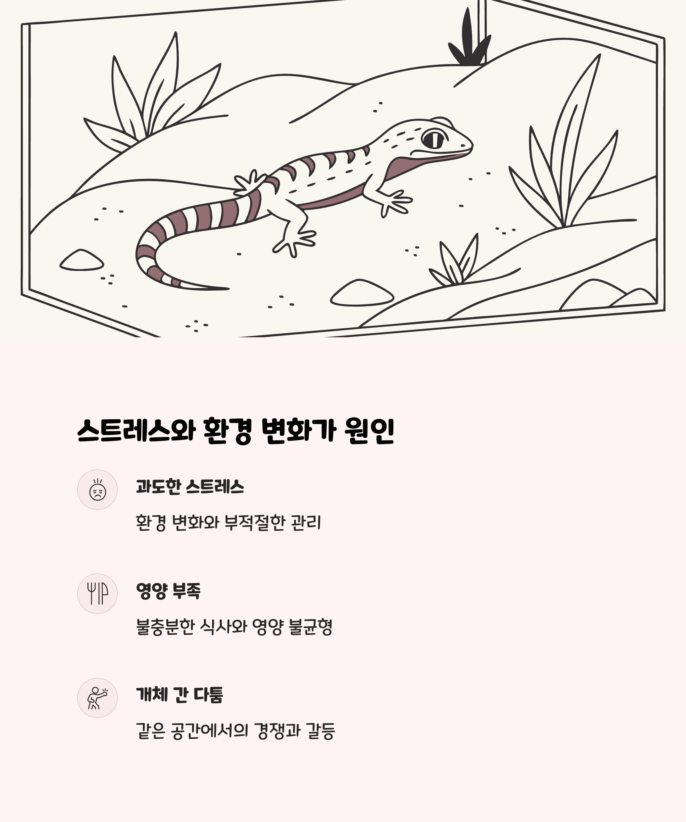 스트레스: 지나친 핸들링, 환경 변화, 소음, 자극 등이 꼬리 자르기 원인이 됩니다.위협감: 낯선 환경이나 개체 간 싸움 등이 꼬리 떼짐을 유발할 수 있습니다.건강 문제: 칼슘, 비타민 D3 부족으로 인한 골격 약화나 부상도 꼬리 손상과 연관성이 있습니다.사육 환경: 케이지 구조, 바닥재나 은신처 부족, 습도 문제 등이 스트레스를 유발합니다.