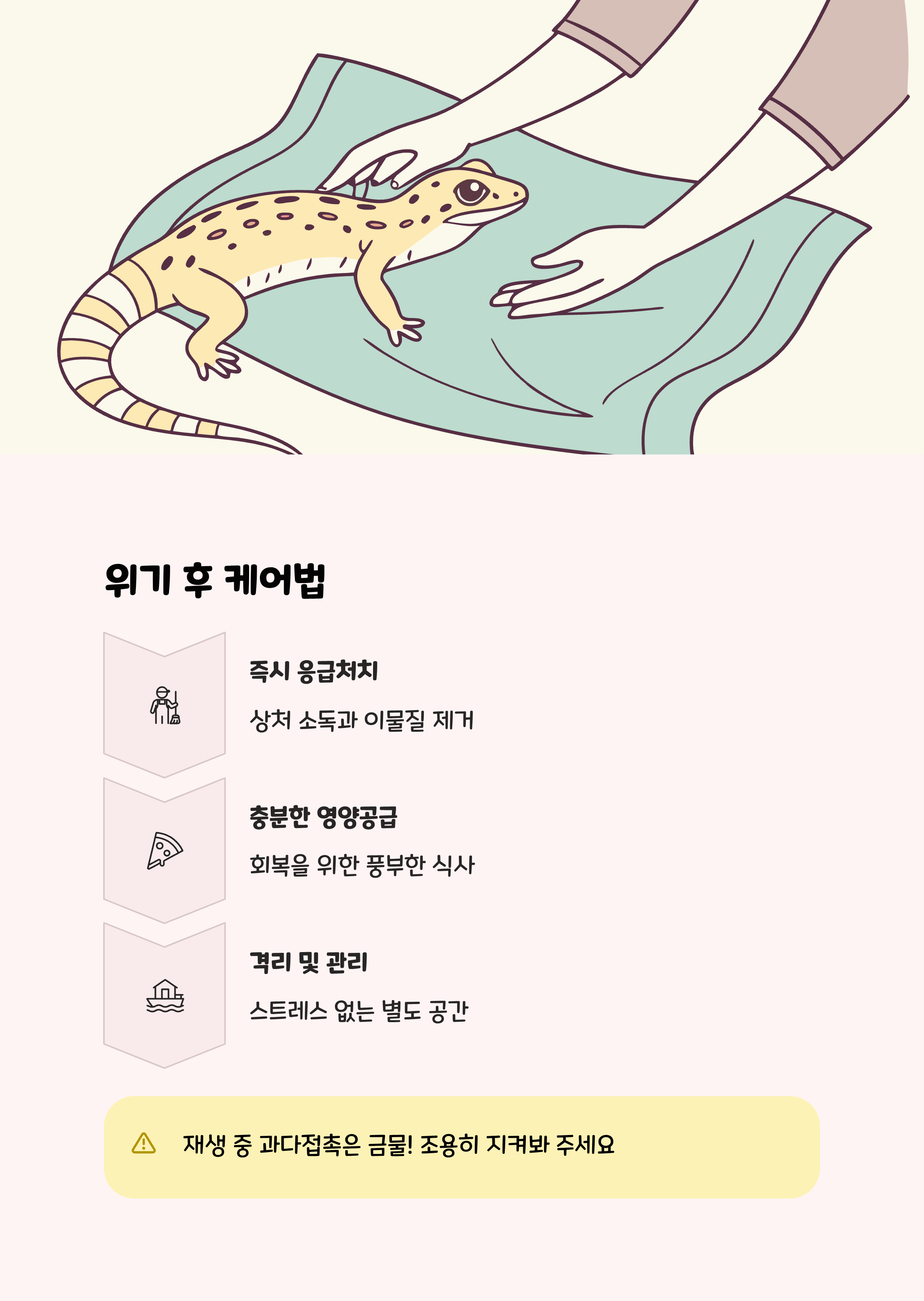 | 관리 방법 | 상처 소독, 스트레스 감소, 영양 보충, 환경 개선 | 꼬리 재생과 건강 위해 중요 |