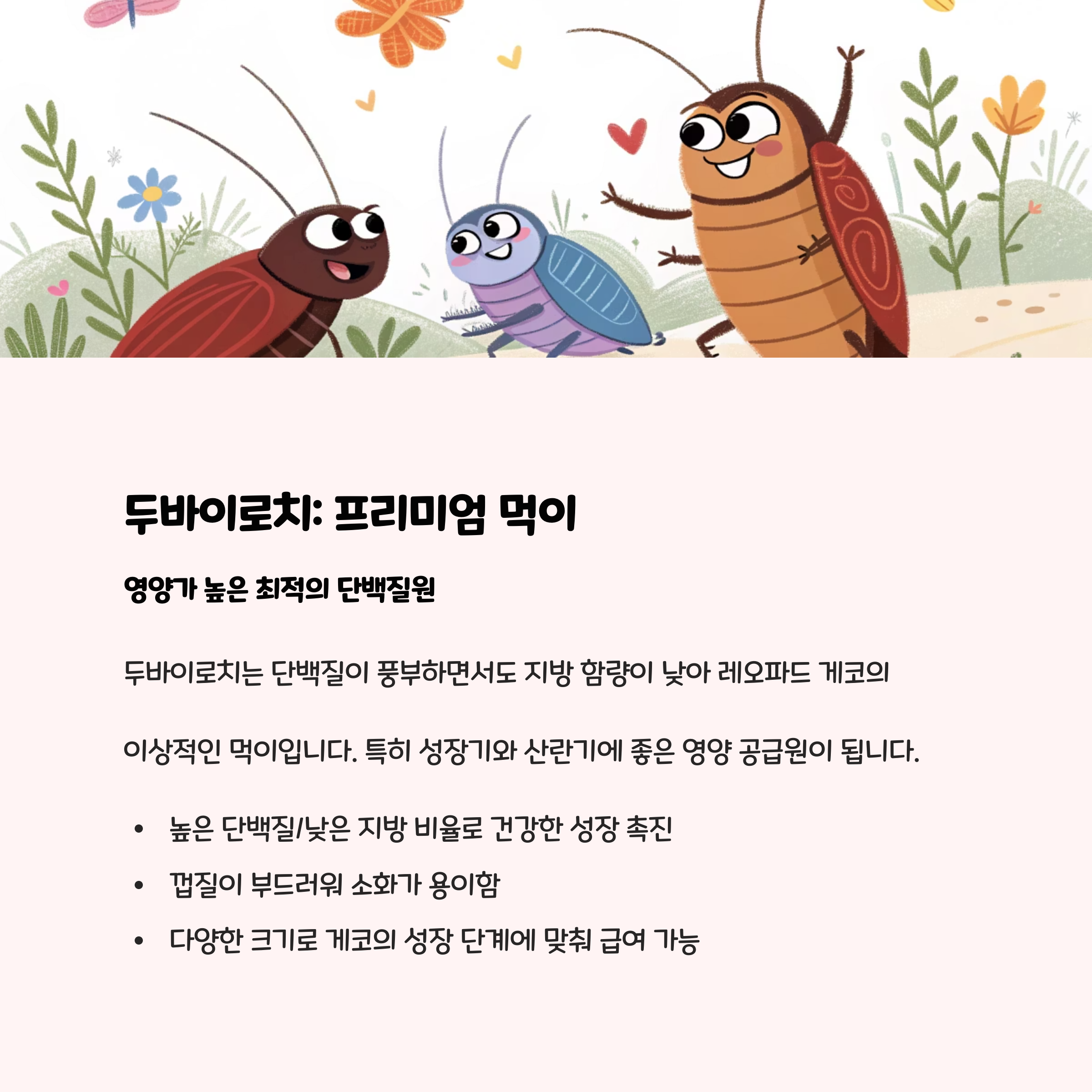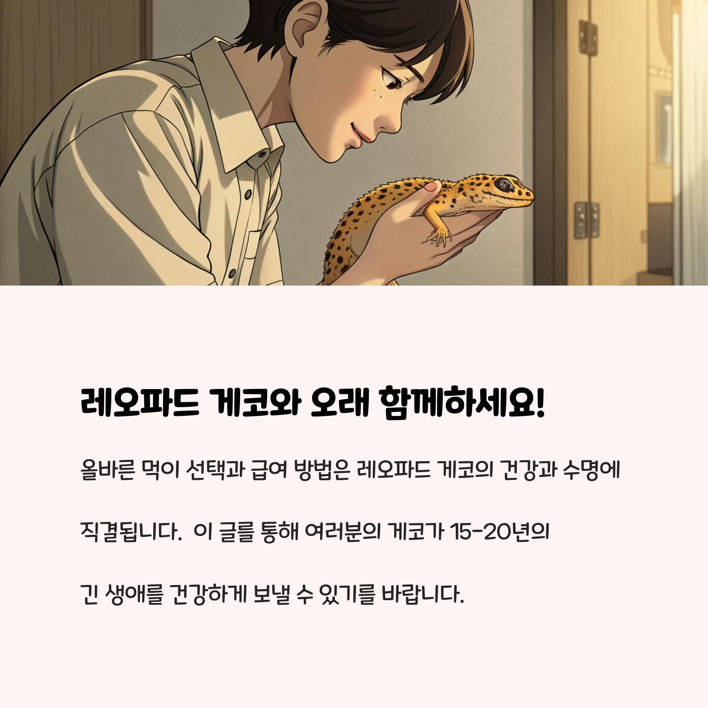 레오파드 게코의 건강을 위해서는 다양한 먹이를 균형 있게 급여하고, 칼슘과 비타민D3 보충, 그리고 환경 관리가 필수입니다. 귀뚜라미와 밀웜, 슈퍼밀웜, 인공사료까지 각각의 장단점을 잘 이해하고, 개체의 성장 단계와 건강 상태에 맞춘 맞춤 급여가 가장 중요합니다. 먹이 선택과 급여법만 잘 지켜도, 여러분의 레오파드 게코는 오랫동안 건강하게 함께할 수 있습니다!