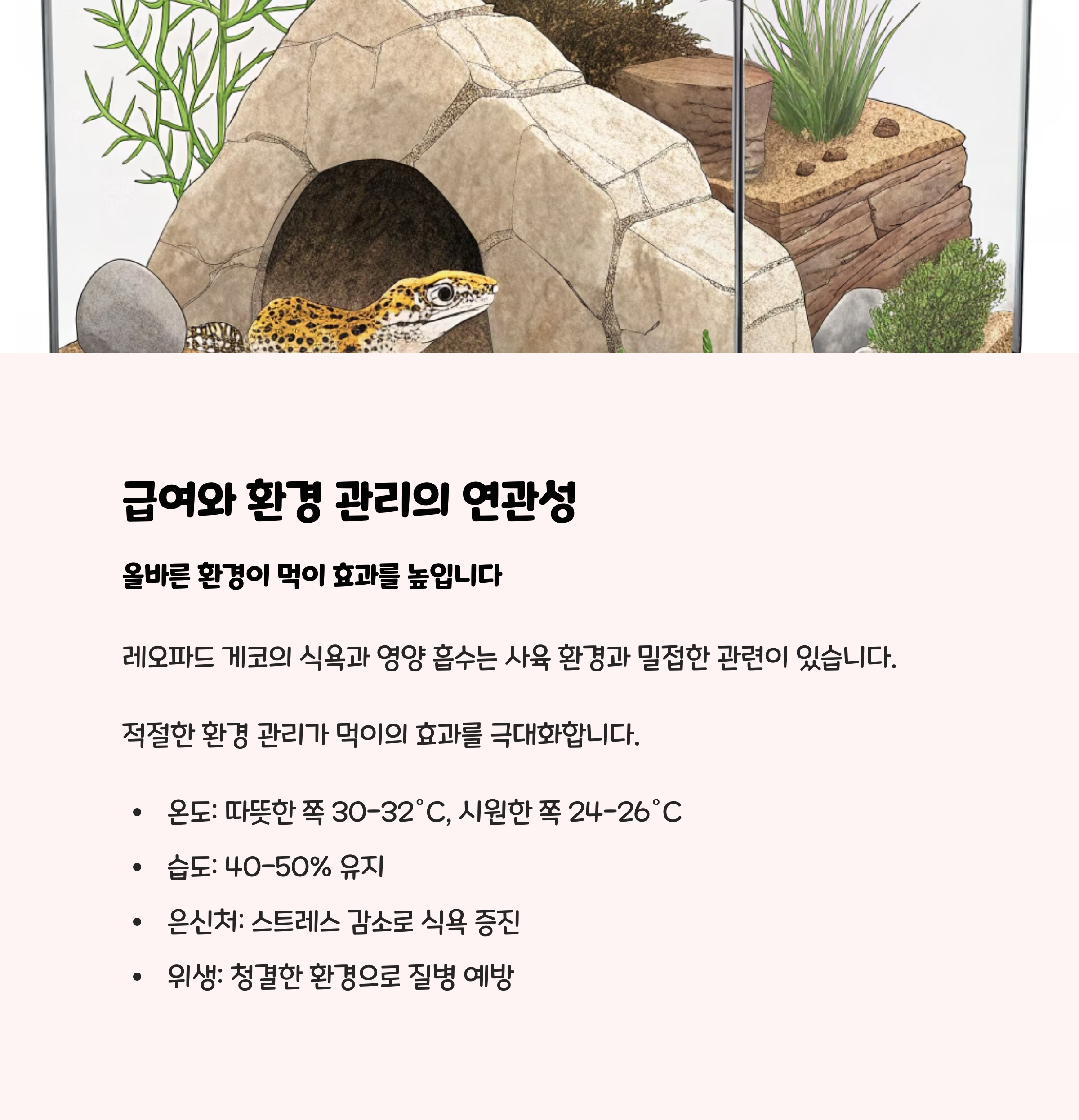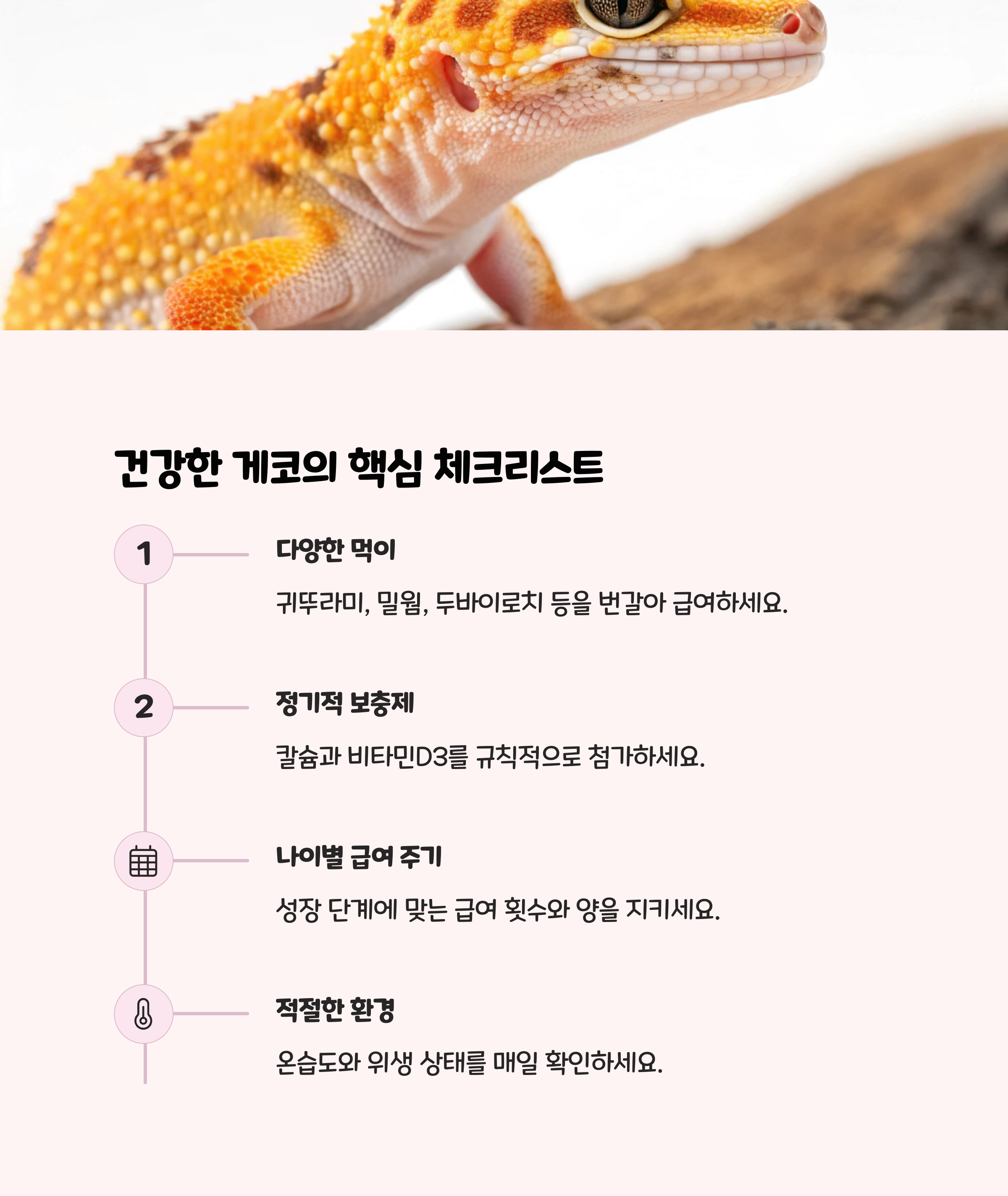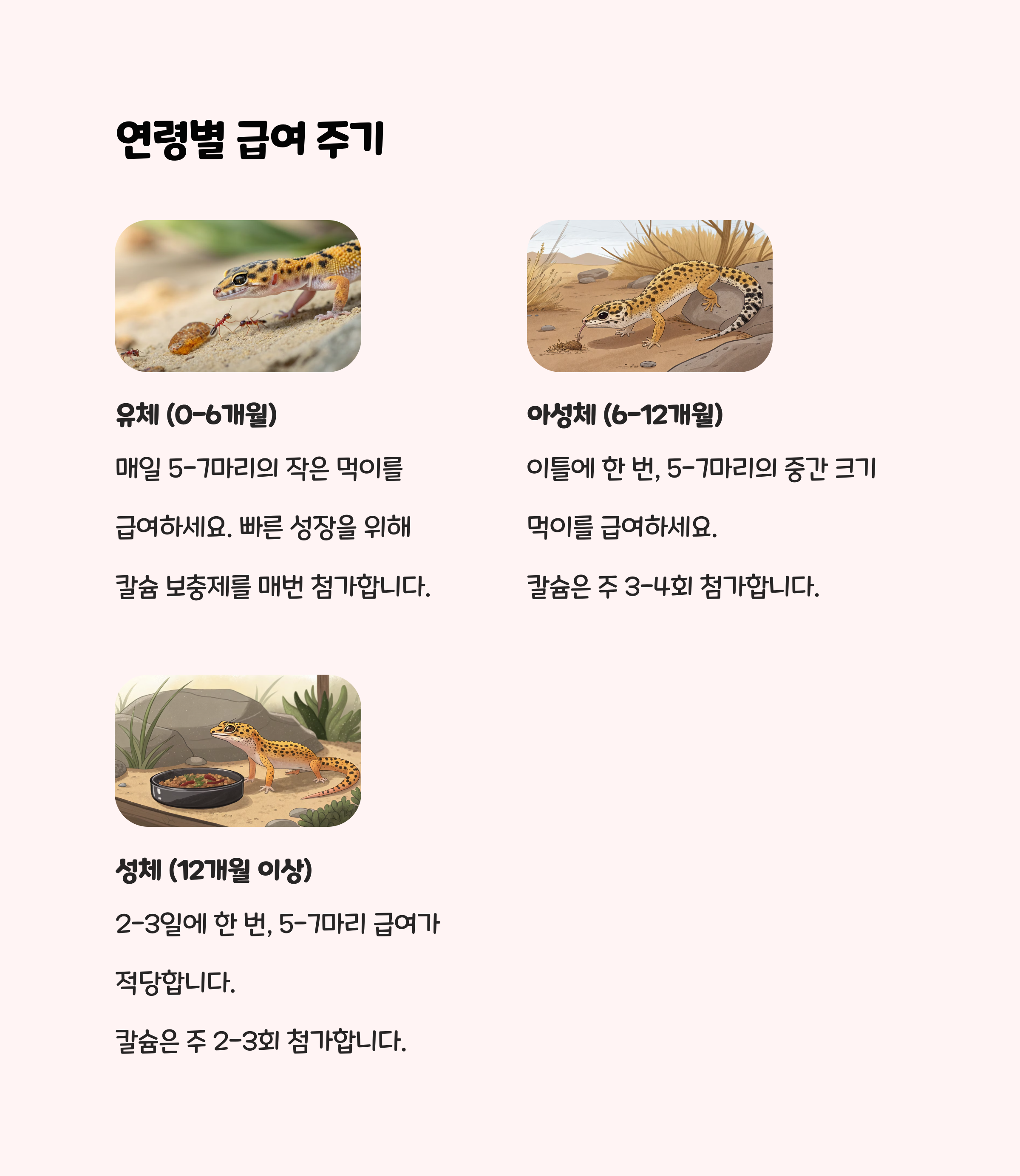 6개월 이하 유체: 매일 급여6개월 이상 성체: 2~3일에 한 번, 15분 내에 먹을 수 있는 양만 제공먹이 크기: 반드시 게코 눈 사이보다 작게칼슘제·비타민D3: 뼈 건강과 성장에 필수, 더스팅 방식으로 주기적으로 첨가과식 주의: 비만 방지를 위해 일정량만 급여습도·온도 유지: 소화와 건강을 위해 사육장 환경도 신경 써야 함(습도 30~40% 권장)