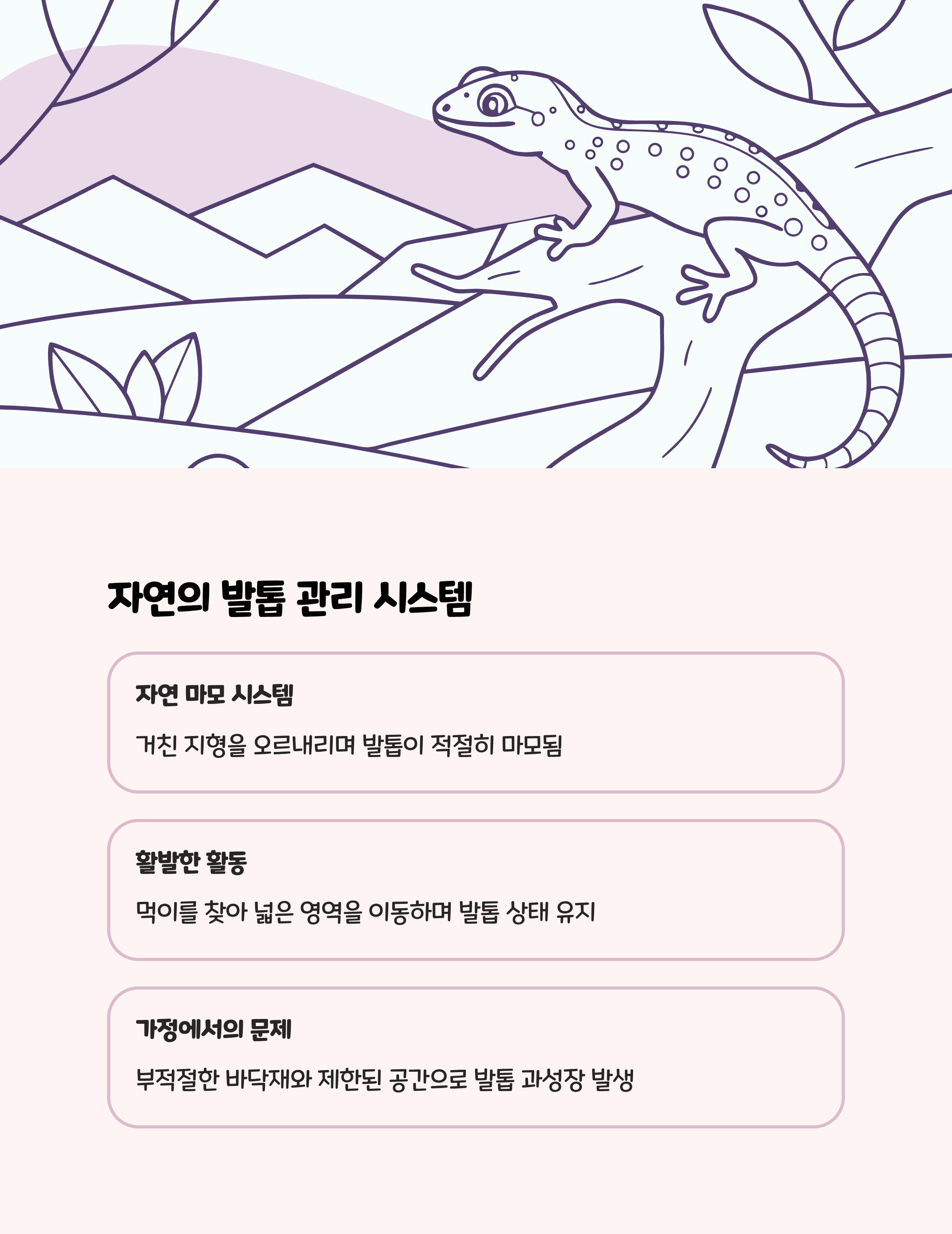 발톱이 너무 길 경우: 카펫이나 은신처에 걸려 다칠 수 있습니다.걸어 다니는 자세가 부자연스러워짐: 관절 및 발가락에 불필요한 스트레스를 유발.탈피 문제로 발톱·발가락에 허물이 남는 경우: 혈액순환 장애 및 괴사 위험이 있습니다.