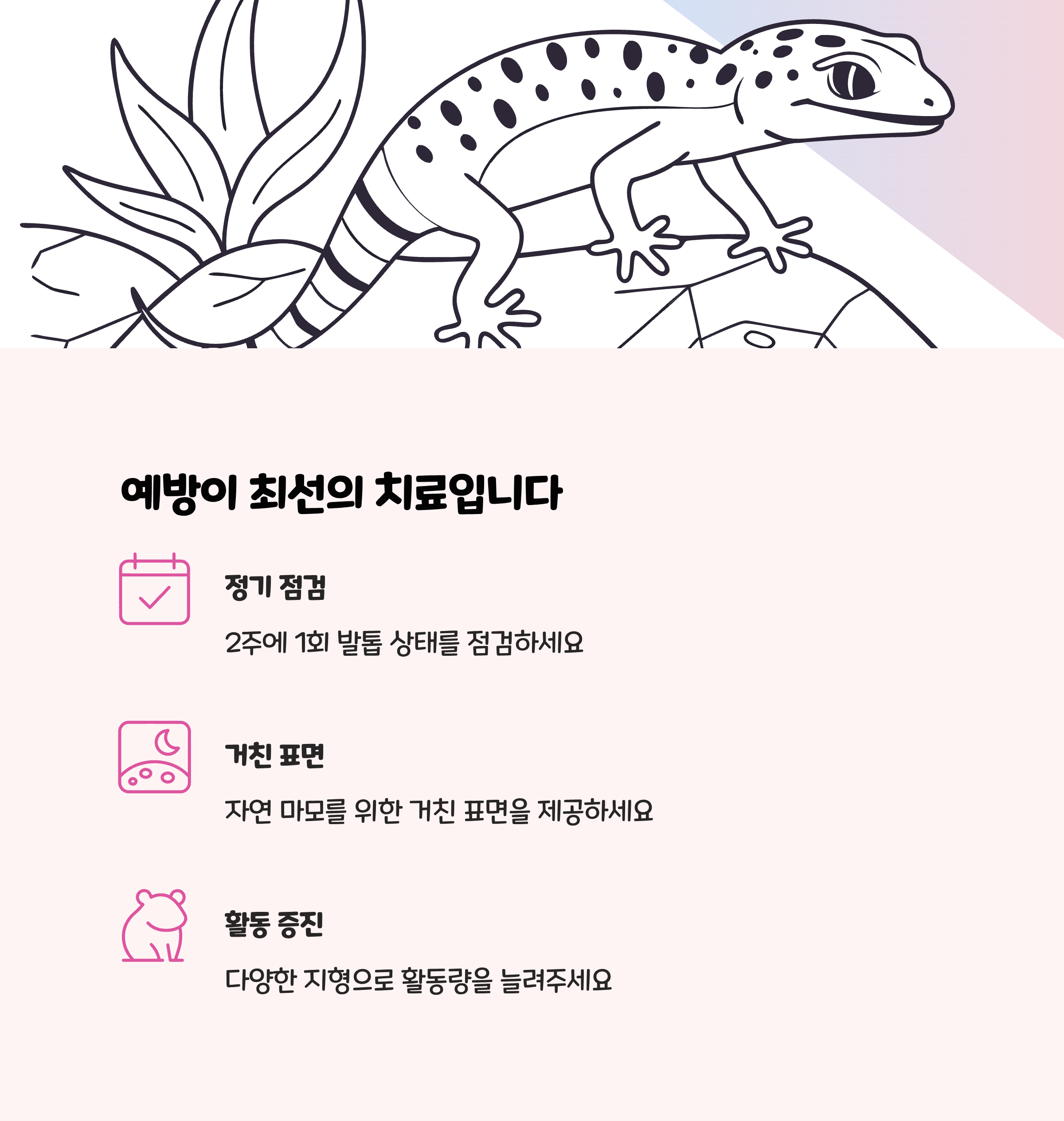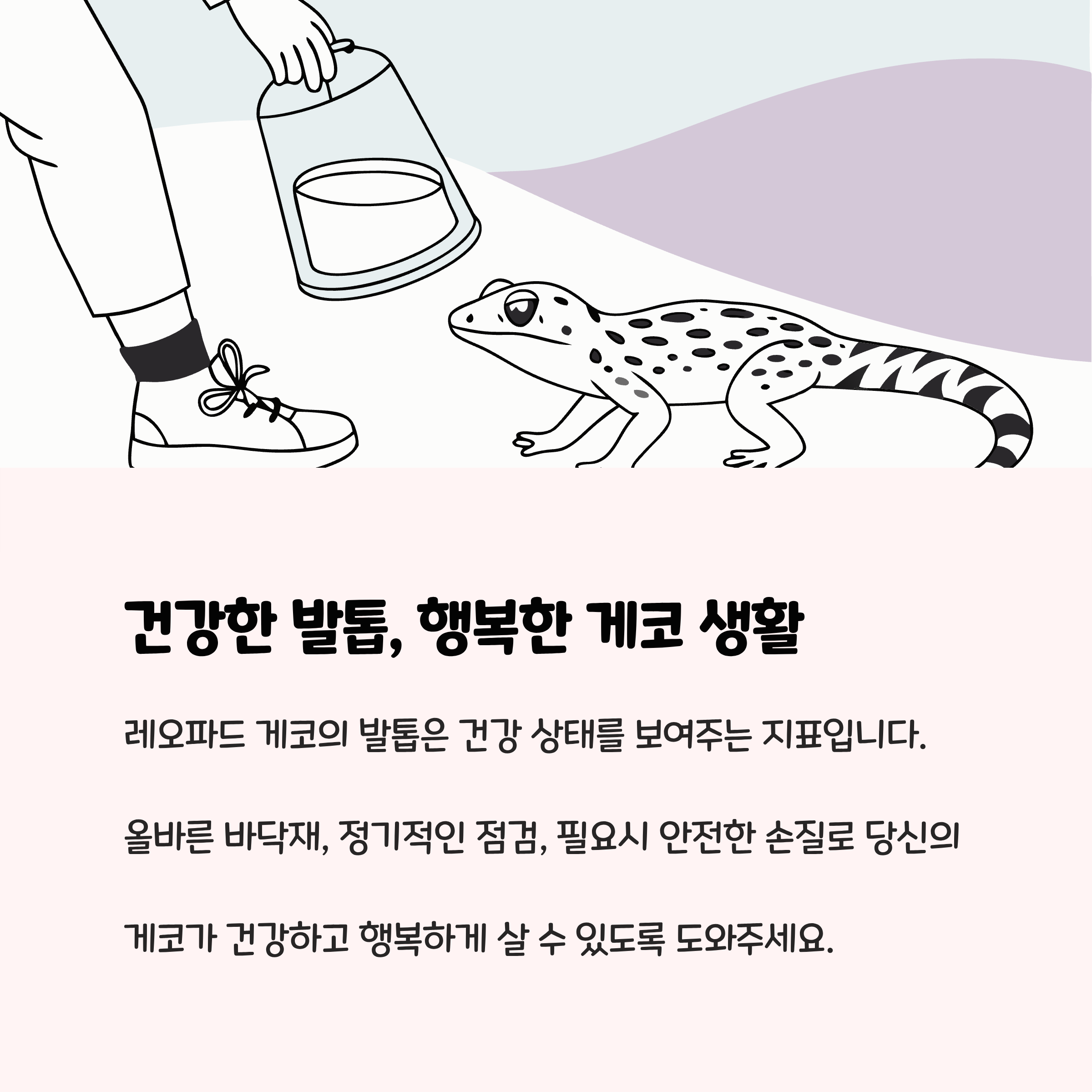 레오파드 게코는 자연적인 환경을 최대한 비슷하게 조성하면 발톱 손질 없이도 건강하게 키울 수 있습니다. 만약 손질이 필요하다면, 항상 혈관을 주의하고, 게코가 스트레스를 받지 않도록 천천히 접근하는 것이 안전합니다. 또한 탈피 시 허물이 발에 남지 않도록 꾸준히 관찰하며, 문제 발생 시 즉각적인 응급처치와 동물 병원 진료가 필요합니다.