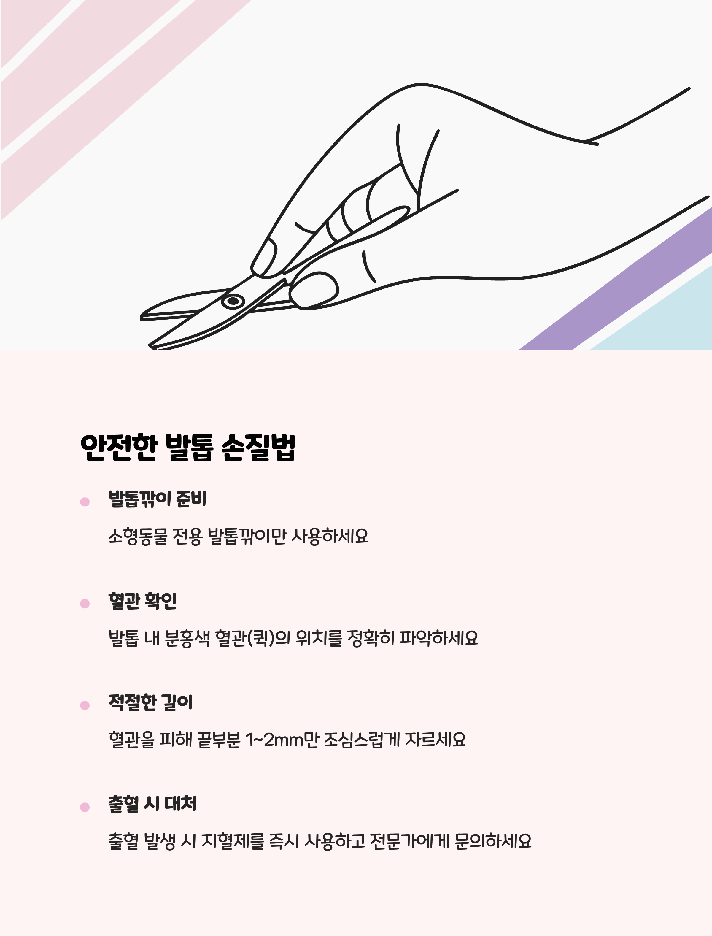 | 발톱 손질 | 소동물 발톱깎이 사용 혈관 피해서 1~2mm 다듬기 |