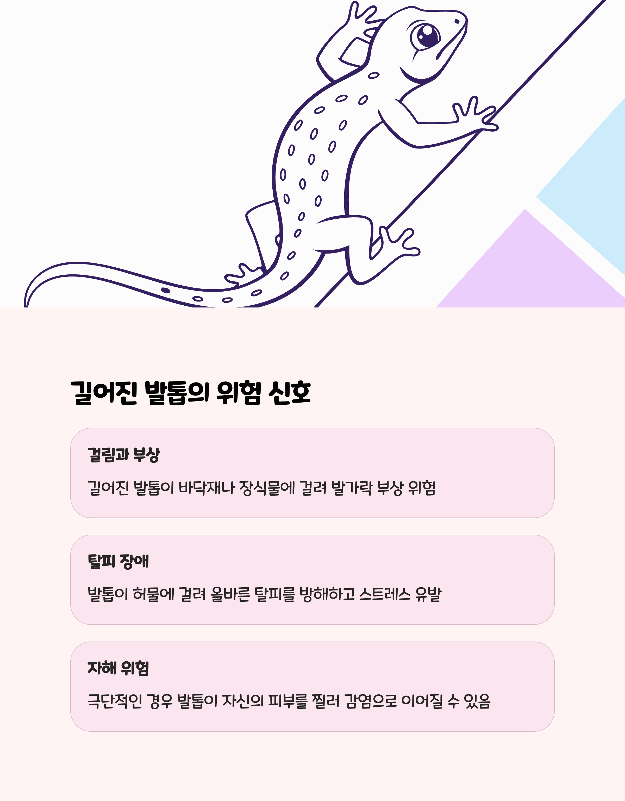 발톱이 너무 길 경우: 카펫이나 은신처에 걸려 다칠 수 있습니다.걸어 다니는 자세가 부자연스러워짐: 관절 및 발가락에 불필요한 스트레스를 유발.탈피 문제로 발톱·발가락에 허물이 남는 경우: 혈액순환 장애 및 괴사 위험이 있습니다.