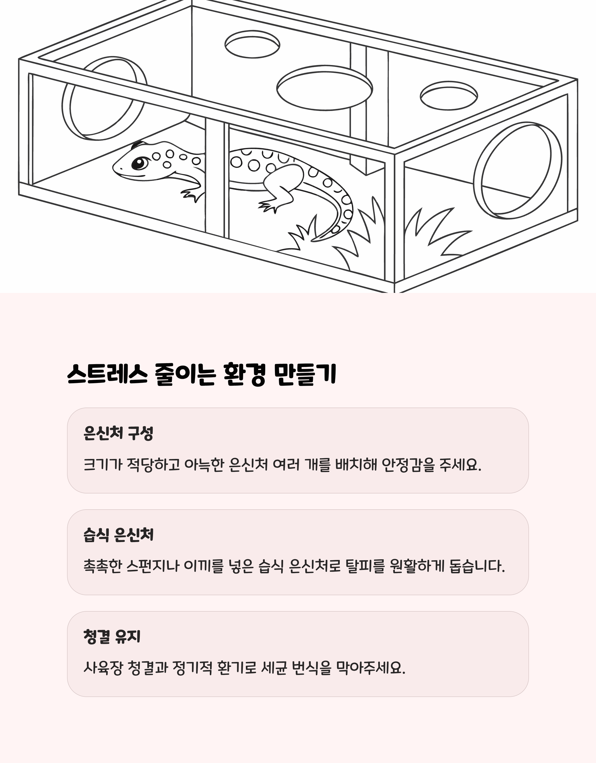 | 스트레스 관리 | 은신처 제공, 잦은 핸들링 금지, 안정적인 환경 유지 |