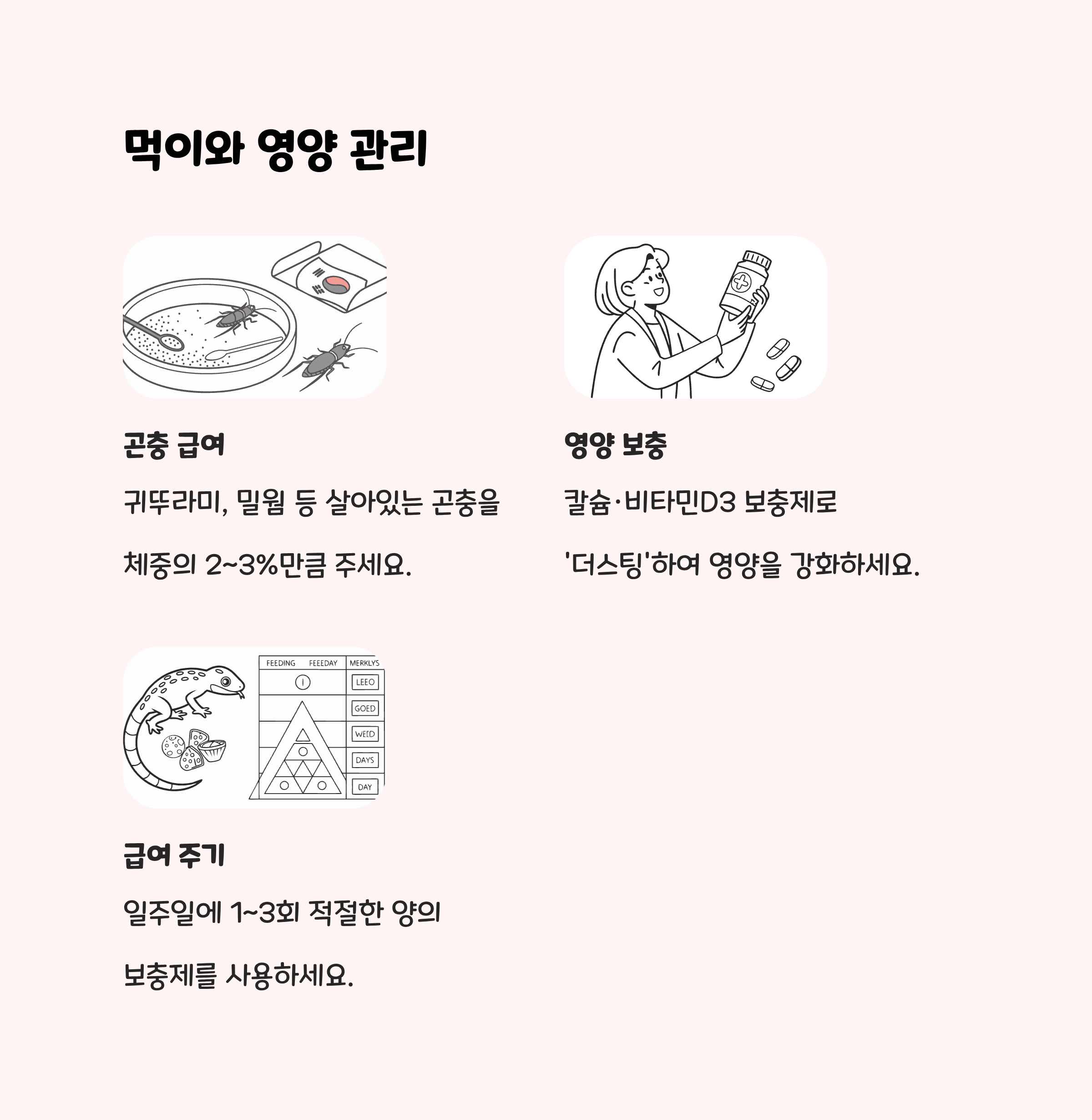 | 먹이 | 귀뚜라미, 밀웜, 슈퍼웜 등 곤충 / 칼슘·비타민 보충 필수 |