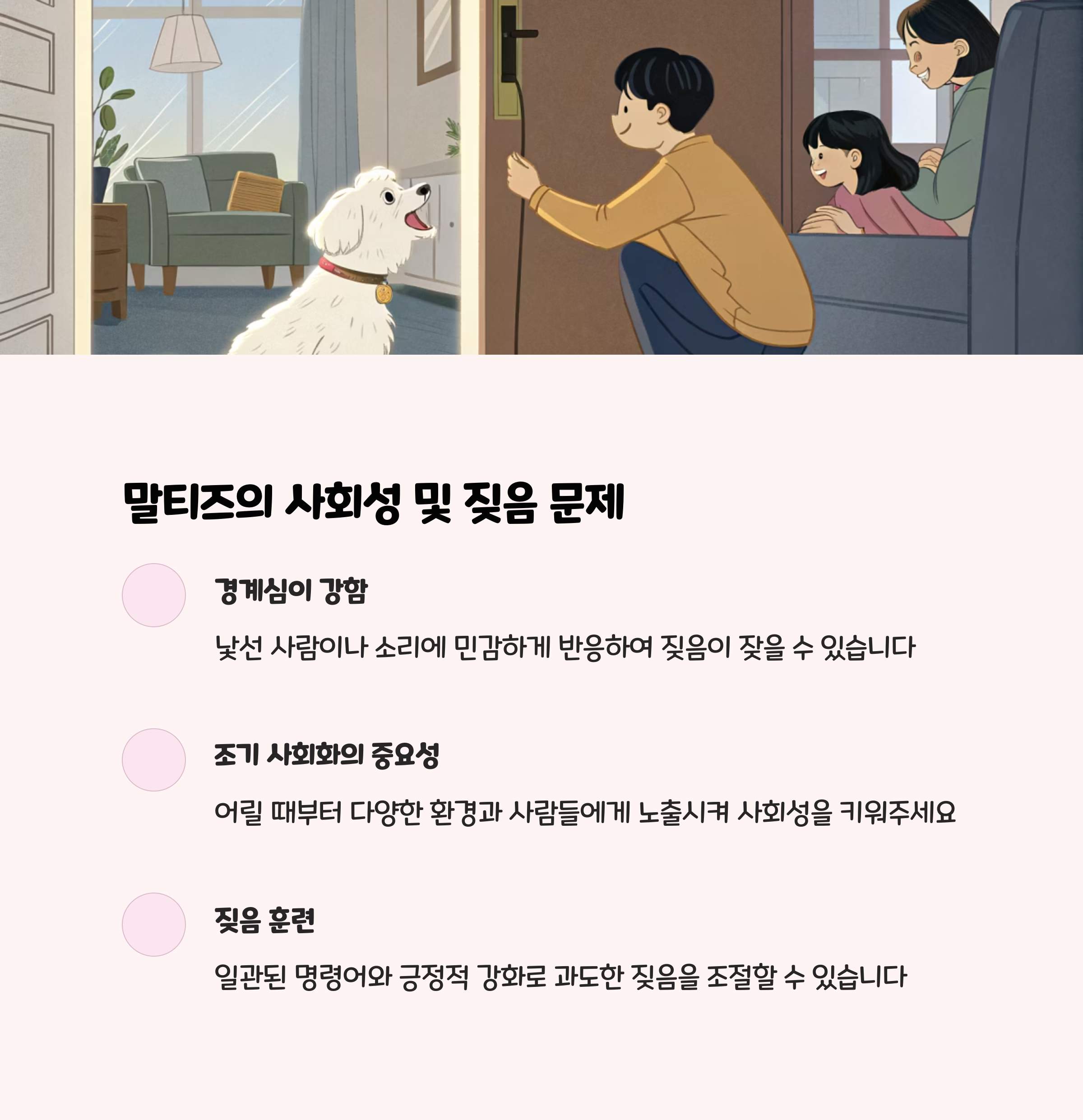 사회화 훈련: 이웃, 다른 반려동물과의 마찰을 줄이기 위해 강아지 시절부터 다양한 사람과 환경을 경험시켜 주세요.짖음 관리: 방문자, 낯선 소리에 짖는 습관은 어릴 때부터 “조용” 명령어와 보상 훈련을 반복해 주는 것이 효과적입니다.건강관리: 슬개골 탈구 예방을 위해 미끄럼 방지 매트, 강아지 계단을 설치하고, 정기적으로 동물병원에서 건강 체크를 받으세요.털 관리: 매일 빗질, 눈물자국 닦기, 귀 청소를 생활화하면 말티즈의 미모와 건강을 오래 유지할 수 있습니다.장시간 외출 시: 혼자 있는 시간이 길어질 경우, 장난감이나 반려동물용 CCTV, 자동 급식기 등을 활용해 분리불안을 완화하세요.