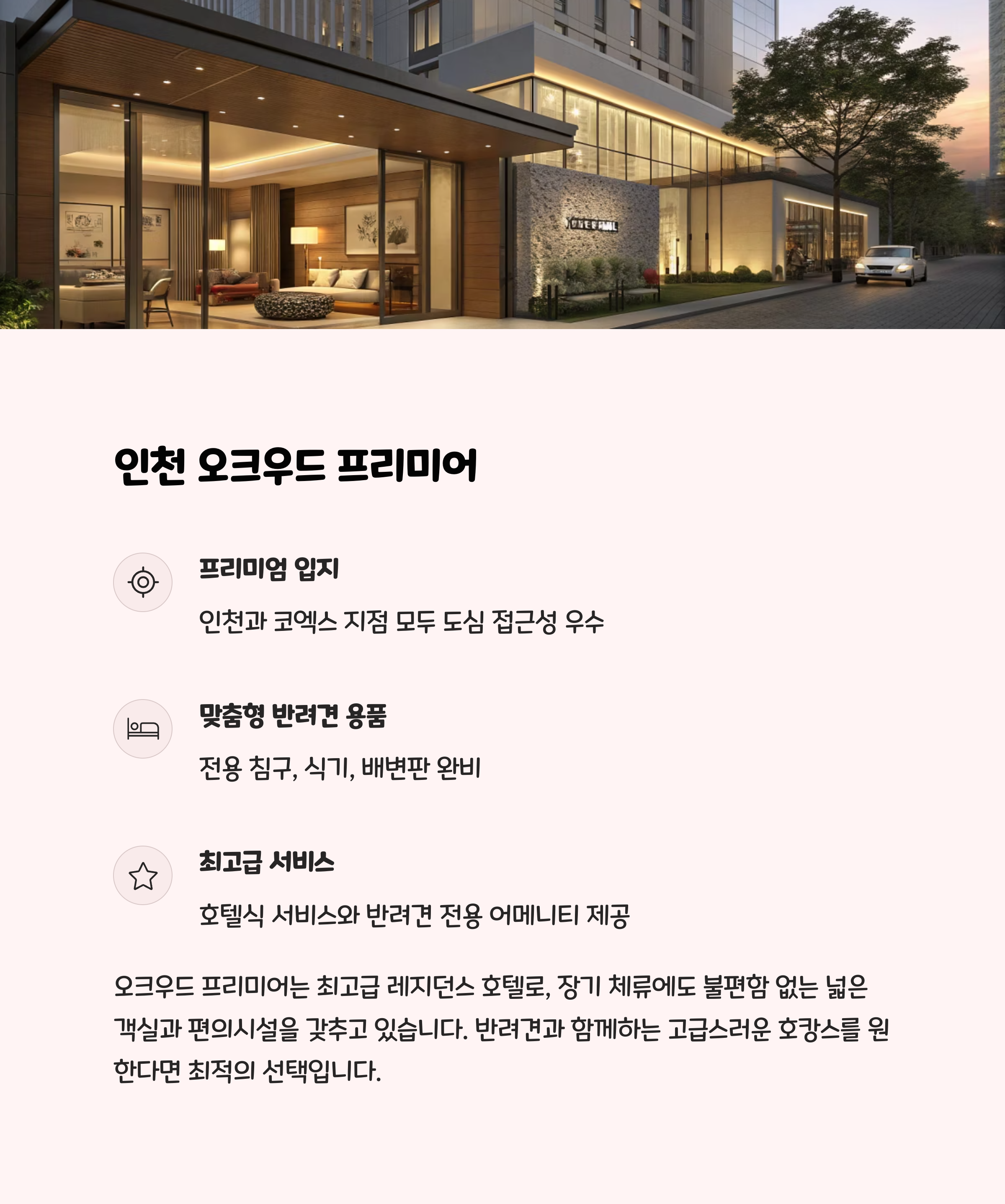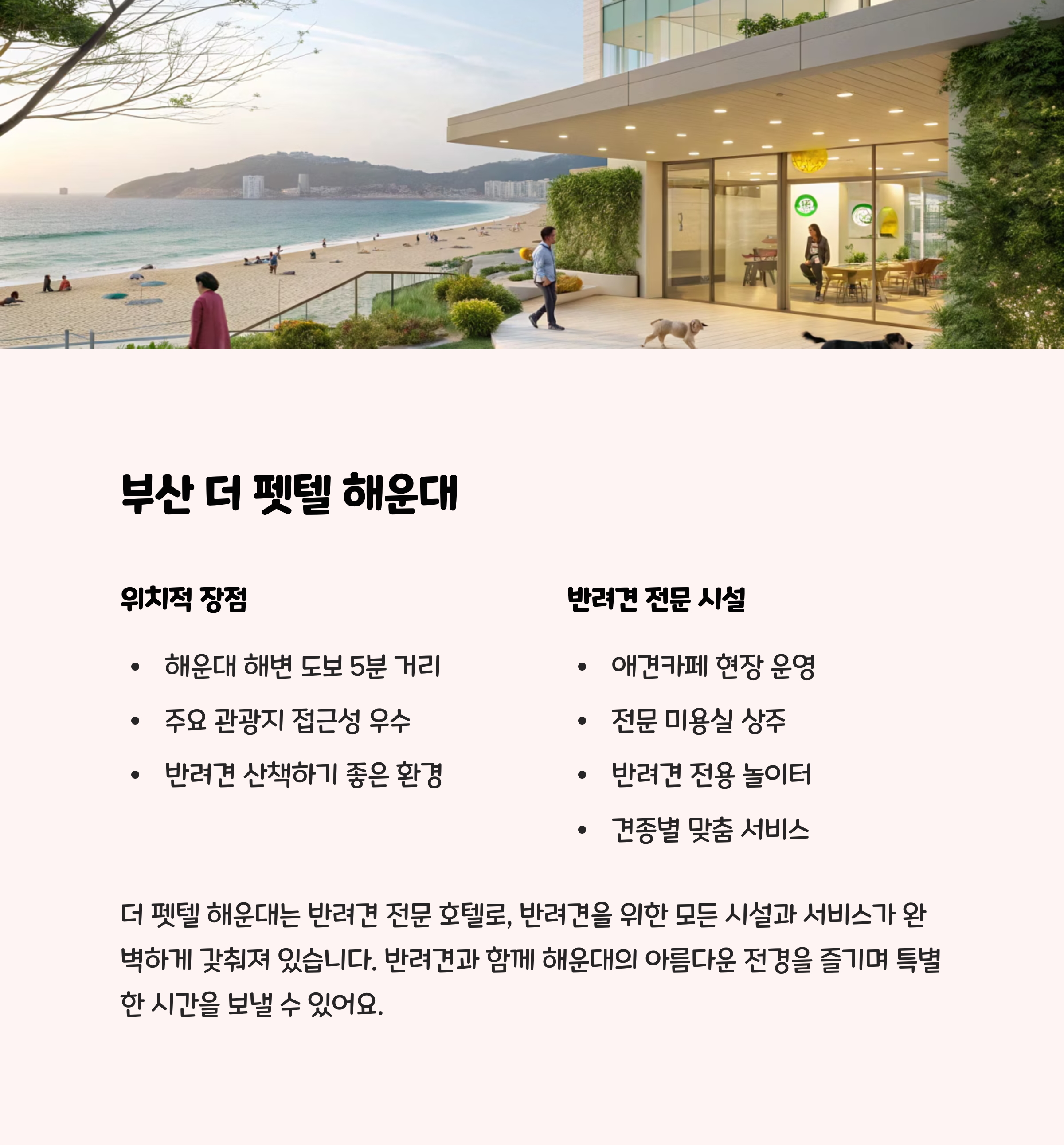 부산 해운대에 위치한 국내 최초 애견 동반 전용 호텔입니다. 전 객실과 모든 시설에서 반려견과 함께할 수 있으며, 반려견 전용 침구, 식기, 배변판은 기본으로 제공됩니다. 애견카페, 미용실, 용품점, 동물병원까지 갖추어 있어 반려견과 여행하는 데 최적의 환경을 제공합니다.