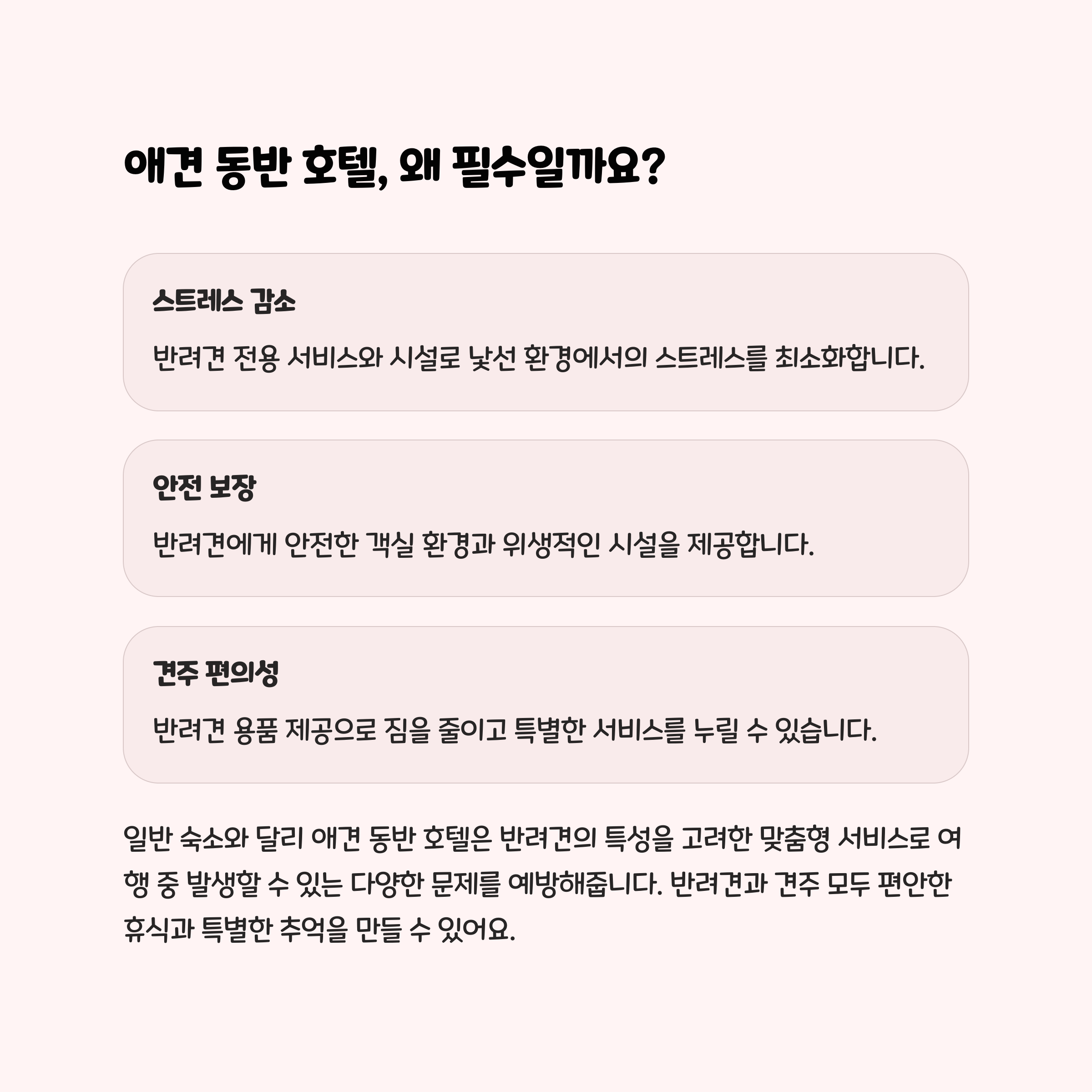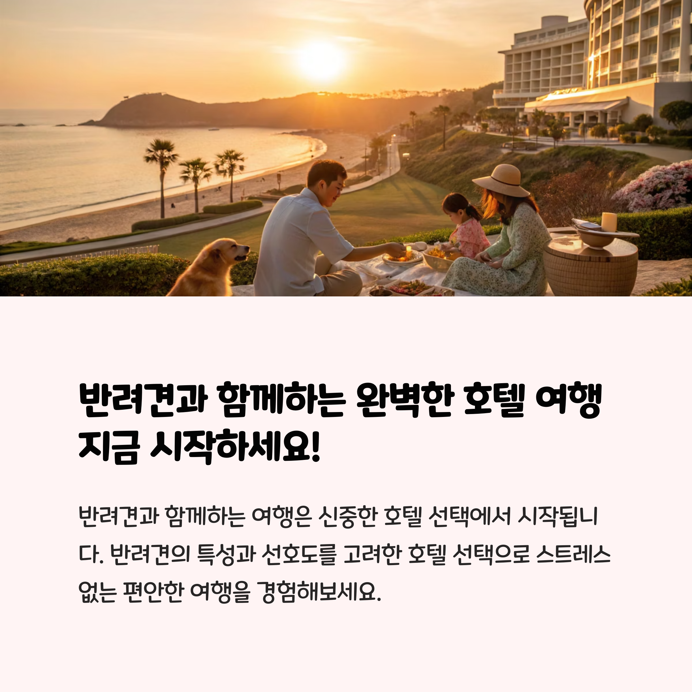 반려견과 함께하는 여행은 소중한 추억을 만드는 시간입니다. 위에서 소개한 호텔들은 반려견과의 편안한 숙박뿐 아니라 다양한 편의시설과 세심한 서비스로 만족도가 높아 많은 반려인들에게 추천받고 있습니다. 여행 계획 시 반려견의 안전과 편안함을 최우선으로 고려해 최적의 숙소를 선택하시길 바랍니다. 행복한 반려동물 여행, 지금 바로 준비해 보세요!