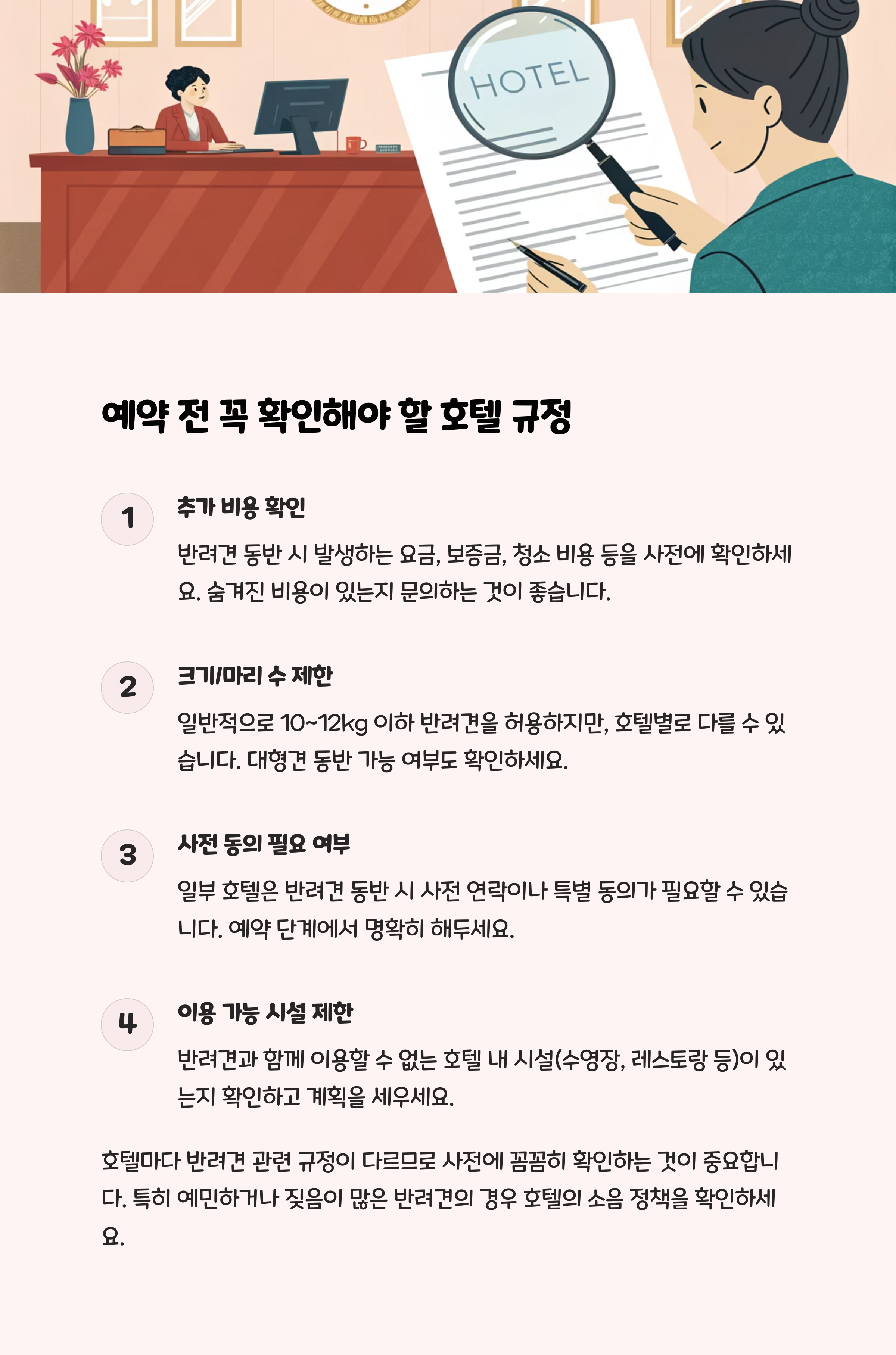 대부분 호텔은 공용 공간에서 목줄 착용, 소음 제한, 배변 처리 의무화, 지정 구역 이용 등을 요구합니다. 규칙 위반 시 퇴실 조치될 수 있으니 반드시 준수해야 합니다.