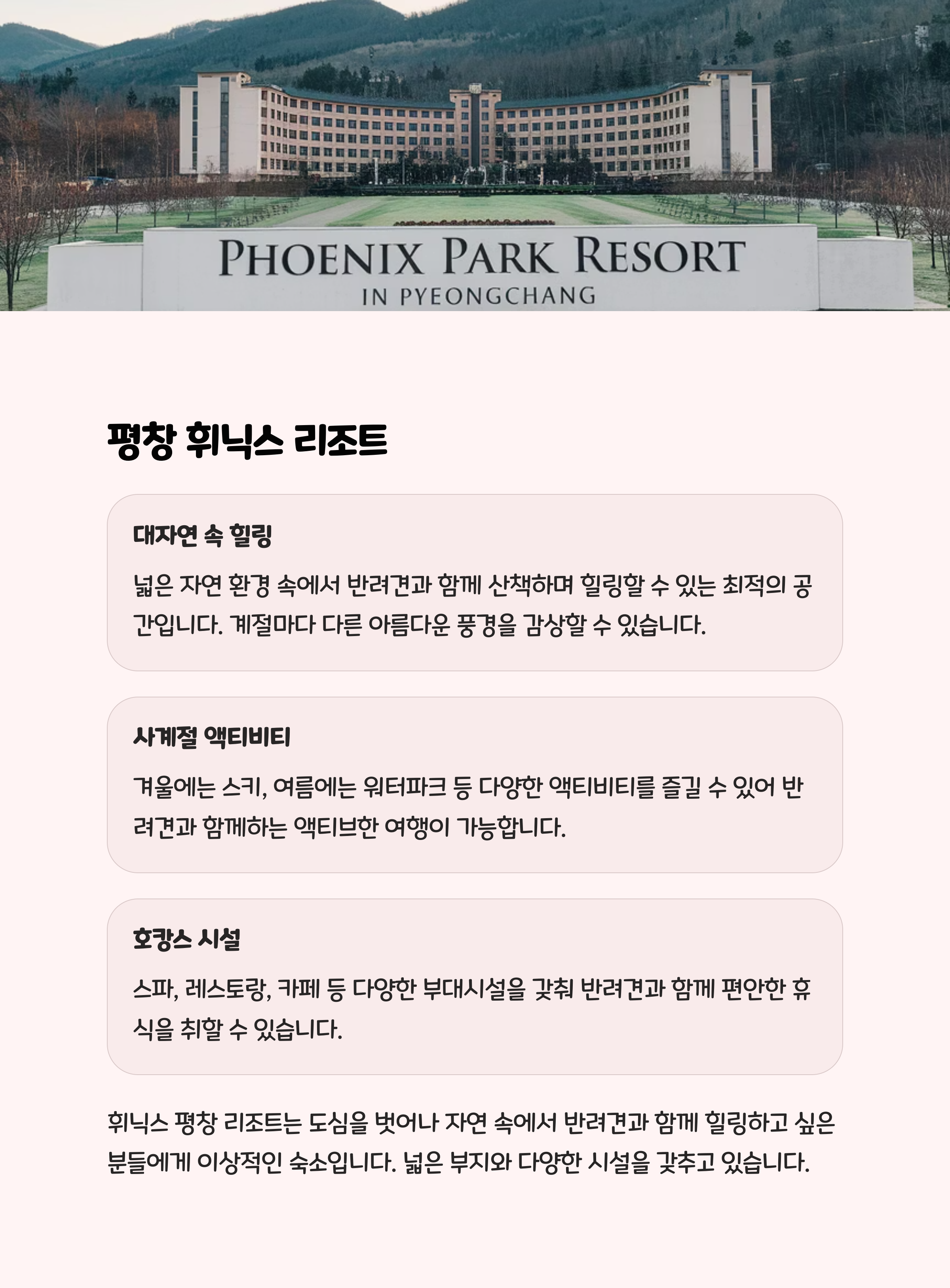 강원도 평창에 위치한 대형 리조트로, 넓은 야외 광장과 바비큐 시설을 갖추고 있어 대형견도 수용 가능합니다(최대 45kg). 반려묘 전용 객실도 마련되어 있어 다양한 반려동물과 함께 머무를 수 있습니다. 자연 속에서 힐링하며 반려견과 뛰어놀기 좋은 환경입니다.
