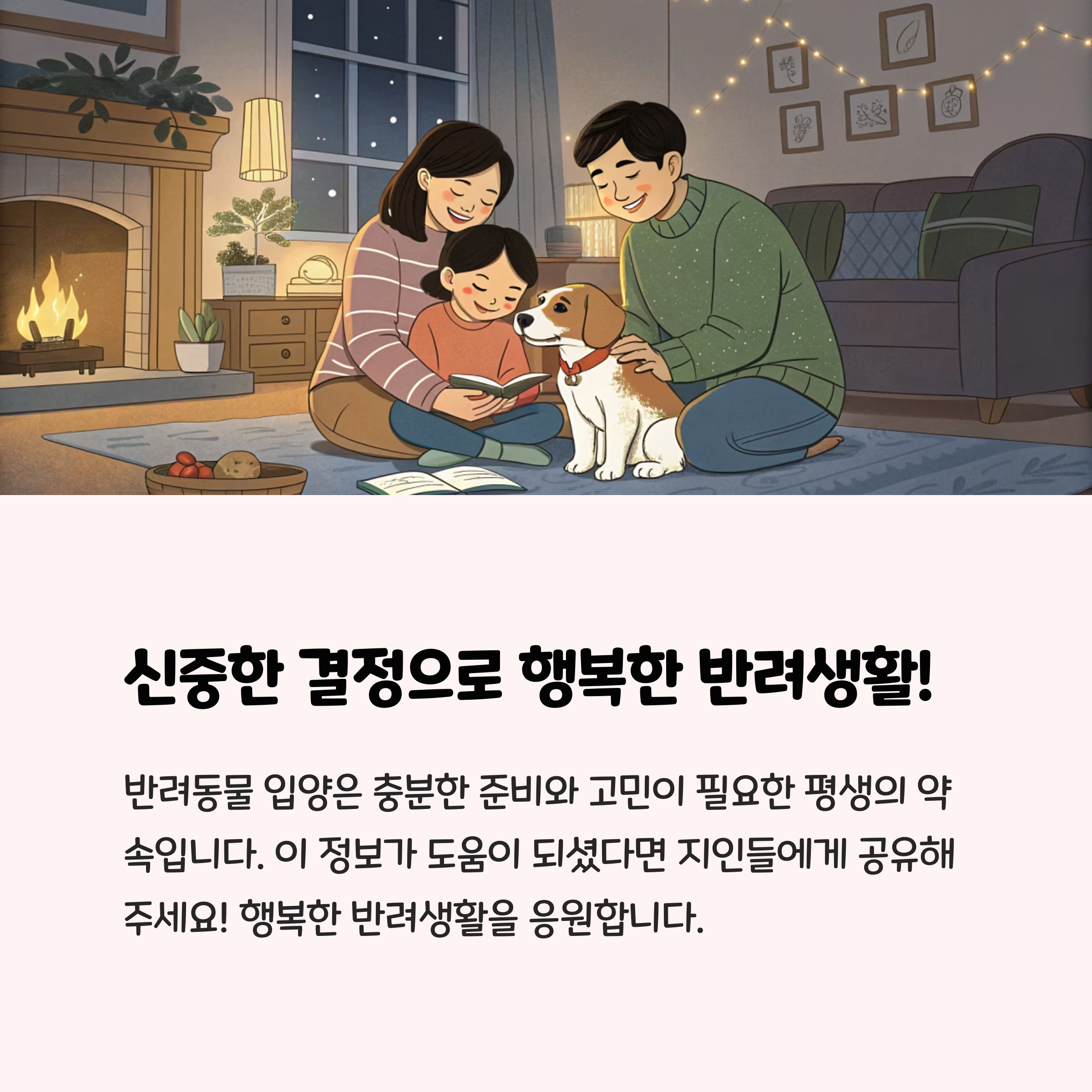가족 구성원 모두의 동의와 책임감: 반려동물은 10~15년 이상 함께하는 가족입니다. 가족 모두의 동의와 장기적인 책임감을 갖고 결정해야 합니다.주거 환경, 경제적 여유, 시간적 여유: 반려동물의 특성에 맞는 환경과 충분한 돌봄 시간이 필요합니다. 알레르기 여부도 미리 확인하세요.충동 입양은 금물: 단순한 감정이나 유행에 휩쓸려 입양하면 재파양, 유기로 이어질 수 있으니 신중하게 결정하세요.