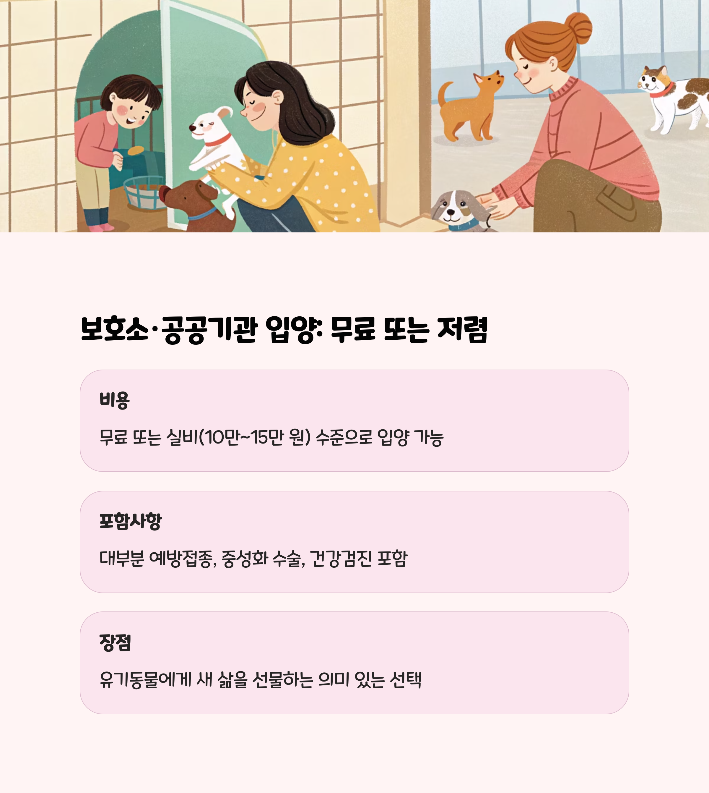 대부분의 공공기관이나 동물보호단체에서는 무료로 입양이 가능하지만, 일부는 예방접종이나 중성화 수술 등 실비 명목으로 10만~15만 원 정도의 비용을 요구하기도 합니다. 그래도 펫샵보다 훨씬 저렴합니다.