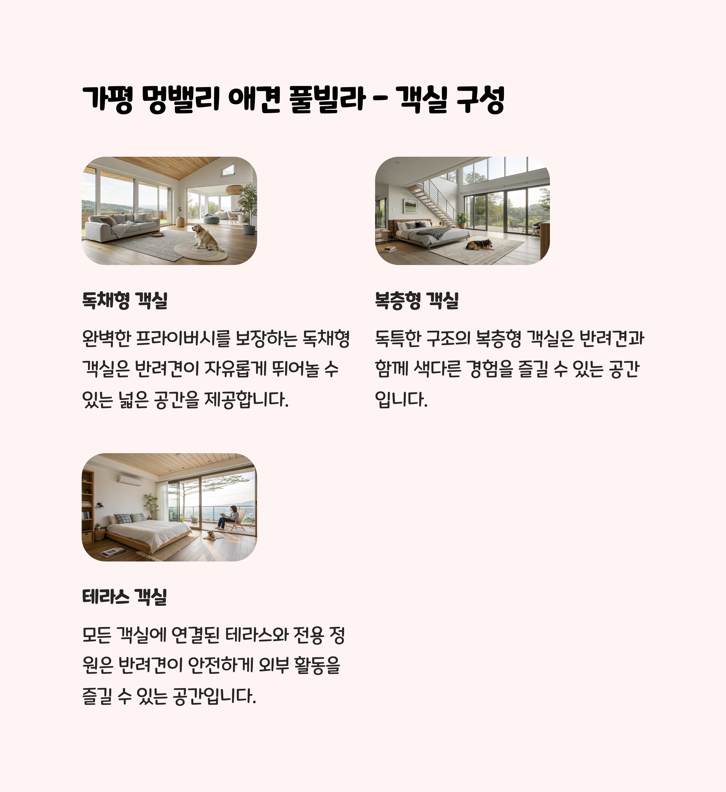 가평에 위치한 ‘멍밸리’는 2021년 7월 오픈한 신축 독채 숙소로, 약 1,100평의 넓은 부지에 세 가지 타입의 객실(단층, 복층, 풀빌라)을 제공합니다. 이곳의 가장 큰 매력은 대규모 인조잔디 운동장과 실내외 온수 수영장입니다. 특히 풀빌라 타입(301, 302동)에는 실내 온수풀이 별도로 마련되어 있어, 계절과 날씨에 상관없이 반려견과 함께 물놀이를 즐길 수 있습니다. 각 객실에는 개별 바비큐 시설이 완비되어 있으며, 반려견 목욕시설도 준비되어 있어 물놀이 후 깔끔하게 마무리할 수 있습니다. 견종 및 무게 제한이 없어 소형견부터 대형견까지 모두 이용 가능하다는 점도 큰 장점입니다.