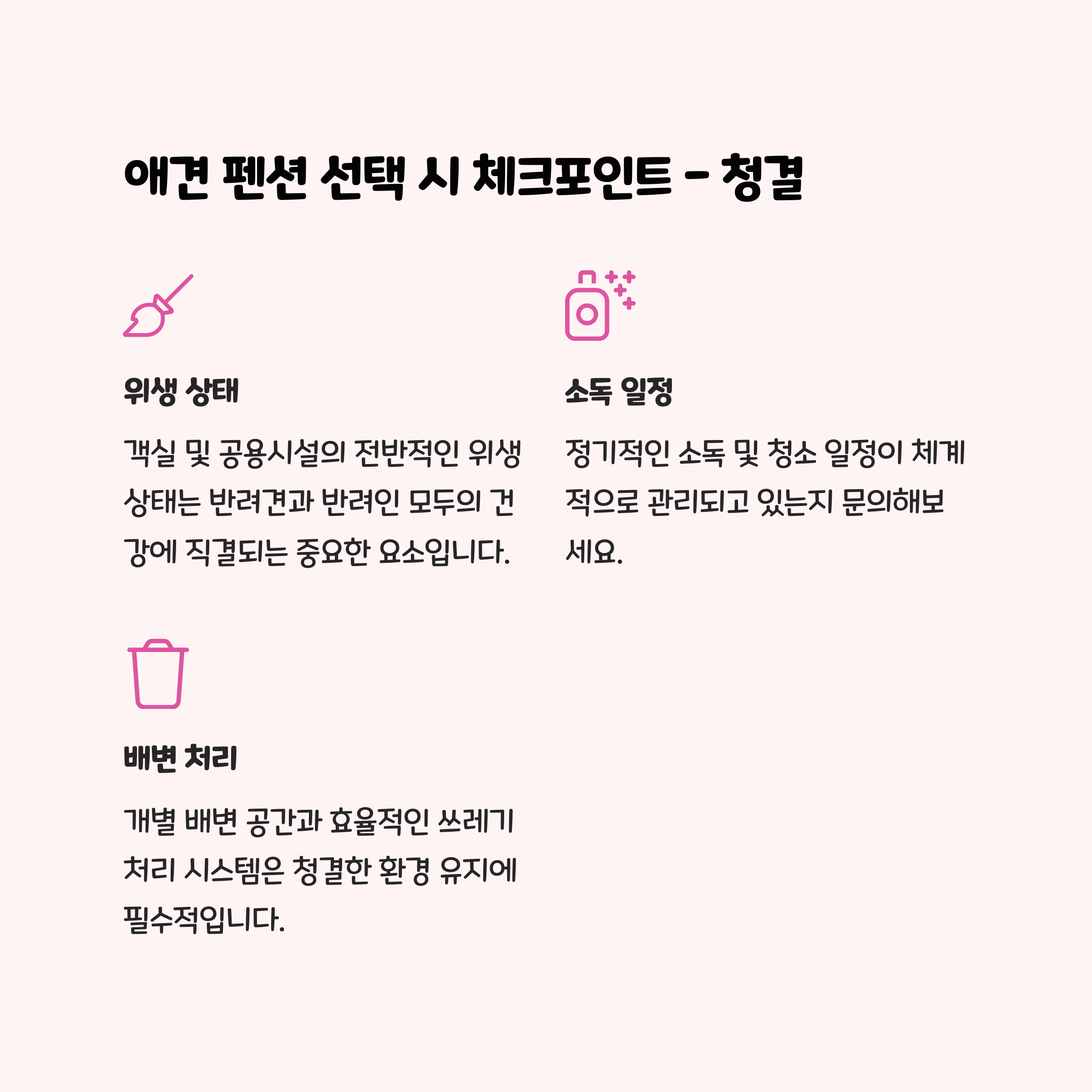 수영장 안전시설: 구명조끼, 미끄럼 방지, 수심 안내 등청결 관리: 수질 관리, 청소 주기, 수영장 물 교체 주기운동장 및 부대시설: 잔디 운동장, 목욕실, 드라이룸 등프라이빗 공간: 독채 여부, 객실별 테라스/마당견종·무게 제한: 대형견, 다견 가족도 이용 가능한지