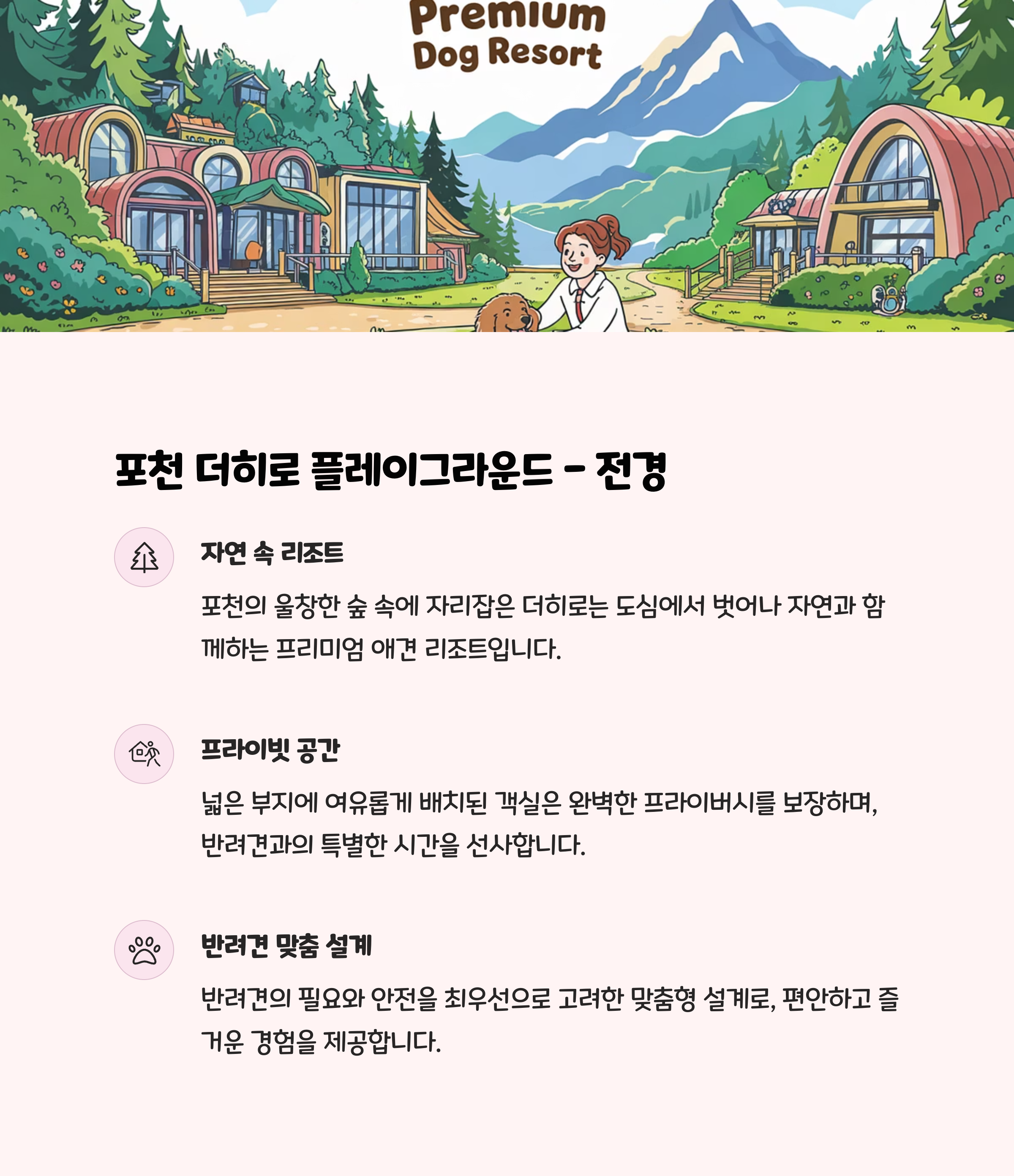 서울 근교 포천에 위치한 ‘더히로 플레이그라운드’는 총 6개의 대형 잔디 운동장과 수심별로 나누어진 강아지 전용 수영장이 특징입니다. 날씨 좋은 날에는 야외 수영장에서 신나게 물놀이를, 비가 오거나 추운 날에는 실내 운동장에서 에너지를 발산할 수 있습니다. 카라반과 펜션형 숙소 모두 마련되어 있어, 취향에 따라 선택 가능하며, 각 룸 앞에서 바로 바비큐와 불멍을 즐길 수 있습니다. 반려견과 보호자 모두가 스트레스를 날릴 수 있는 힐링 플레이스로, 실제 이용자들의 재방문율도 매우 높습니다.