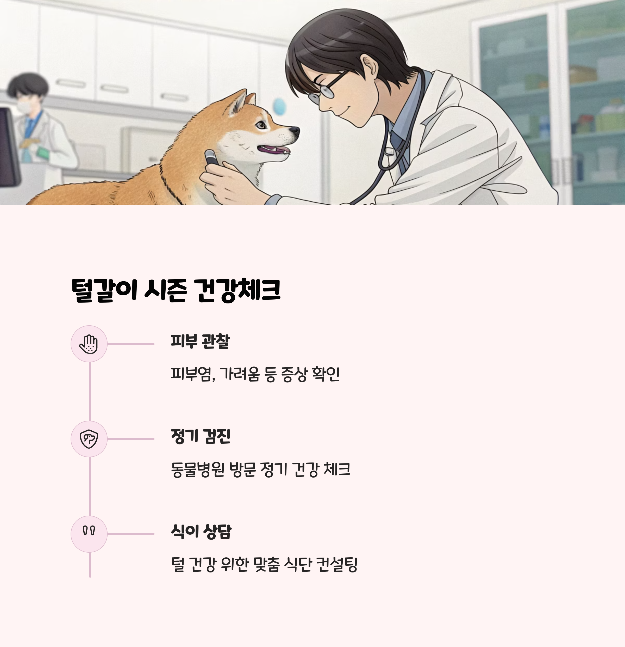 • 건강한 털을 위해 오메가 3 등 영양제를 챙기고, 사료도 신경 써주세요.