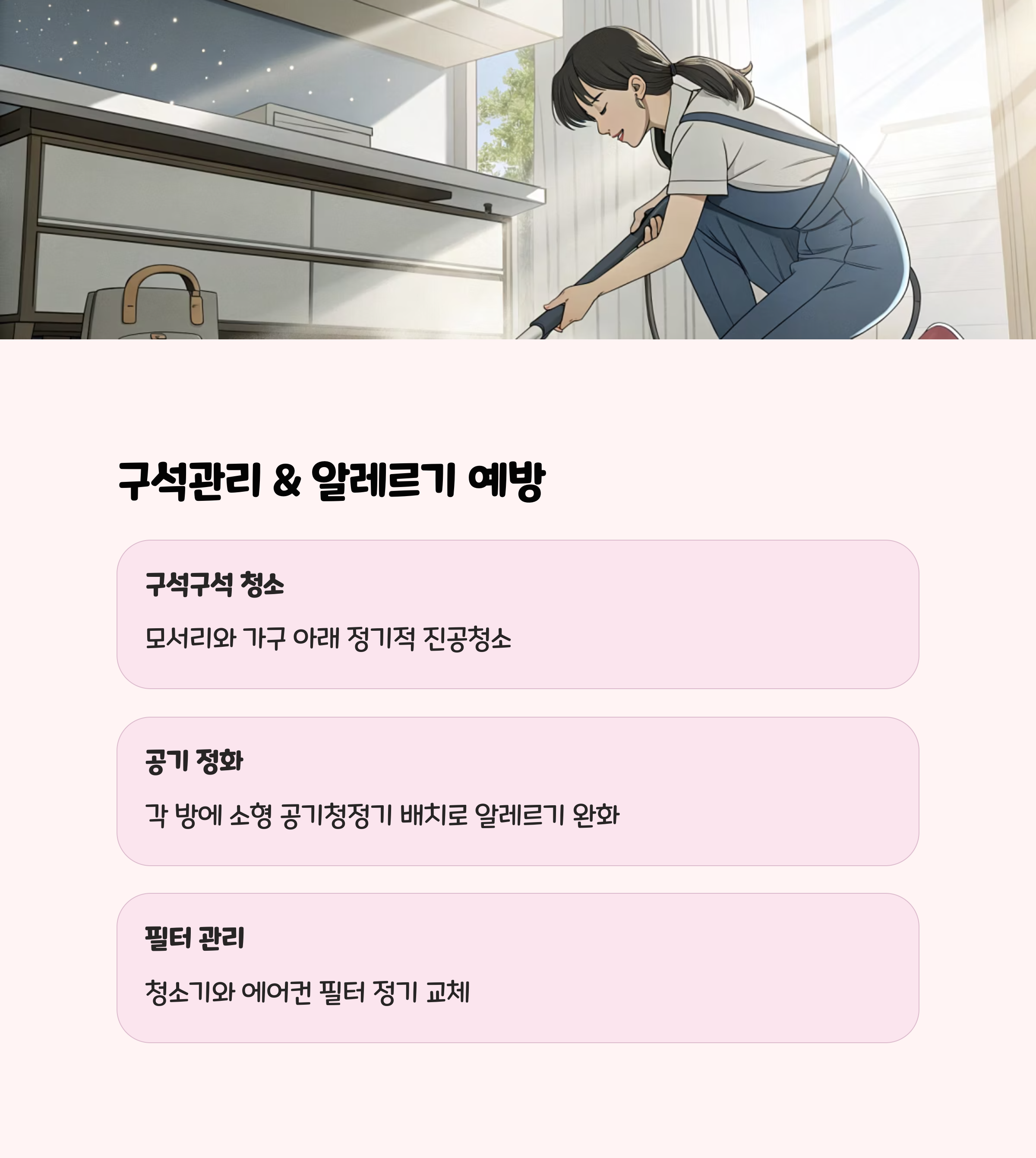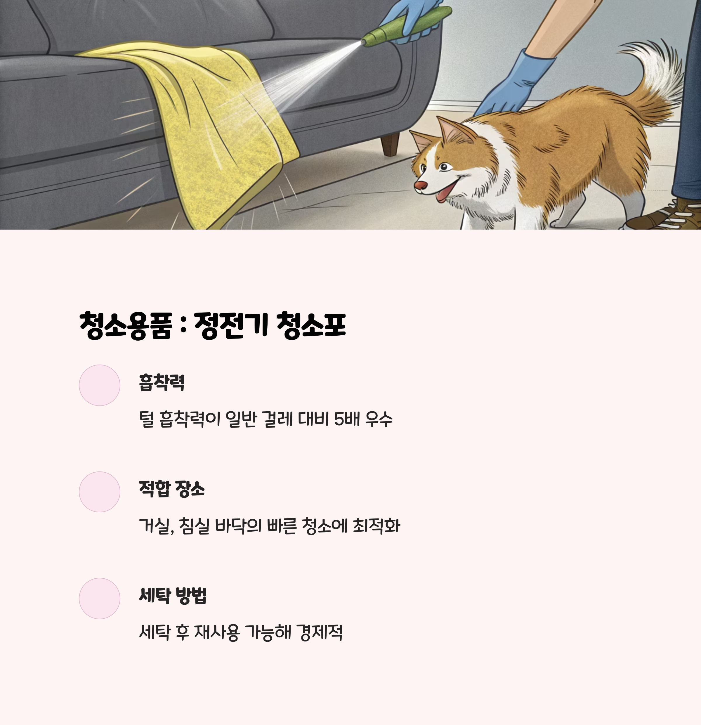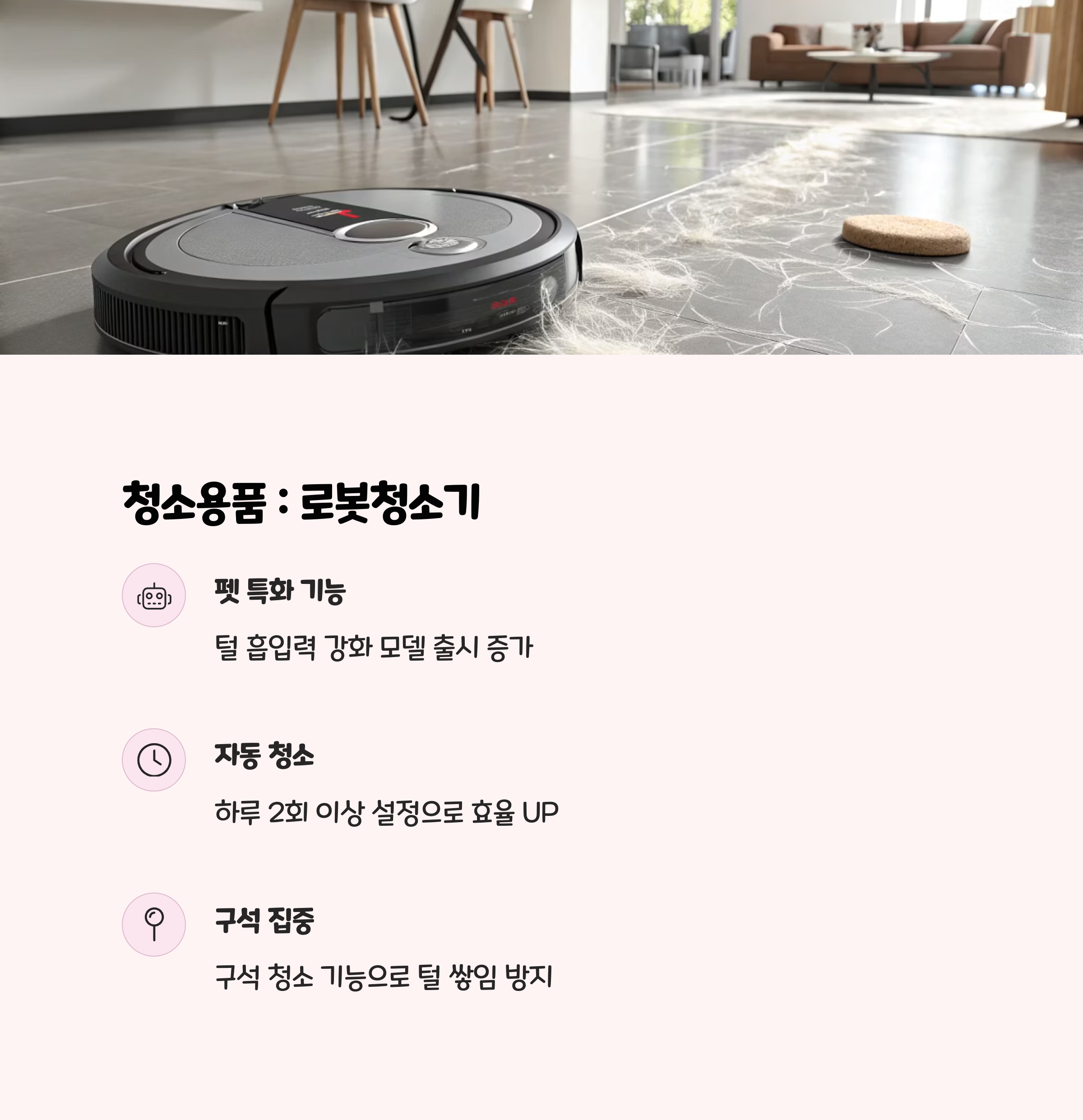 • 공기 중에 떠다니는 미세 털은 공기청정기로, 바닥은 로봇청소기로 관리하면 훨씬 편리합니다.