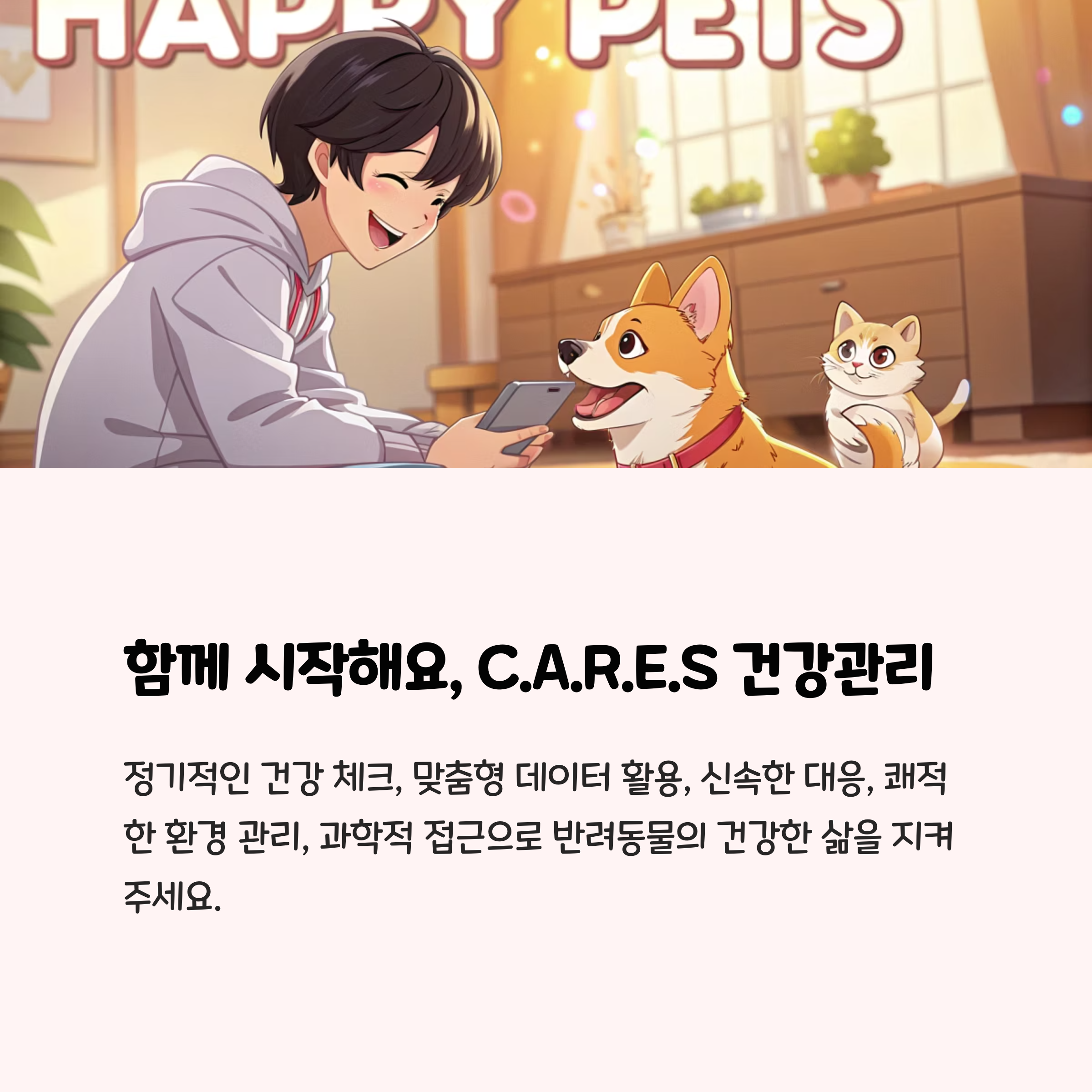 반려동물 건강관리의 핵심은 예방, 데이터, 환경, 그리고 과학적 실천입니다. C.A.R.E.S 트렌드를 일상에서 꾸준히 실천하면 우리 반려동물의 건강과 행복을 오래오래 지켜줄 수 있어요. 여러분은 어떤 건강관리 방법을 실천하고 계신가요? 함께 건강하고 행복한 반려생활, 오늘부터 시작해 보세요!