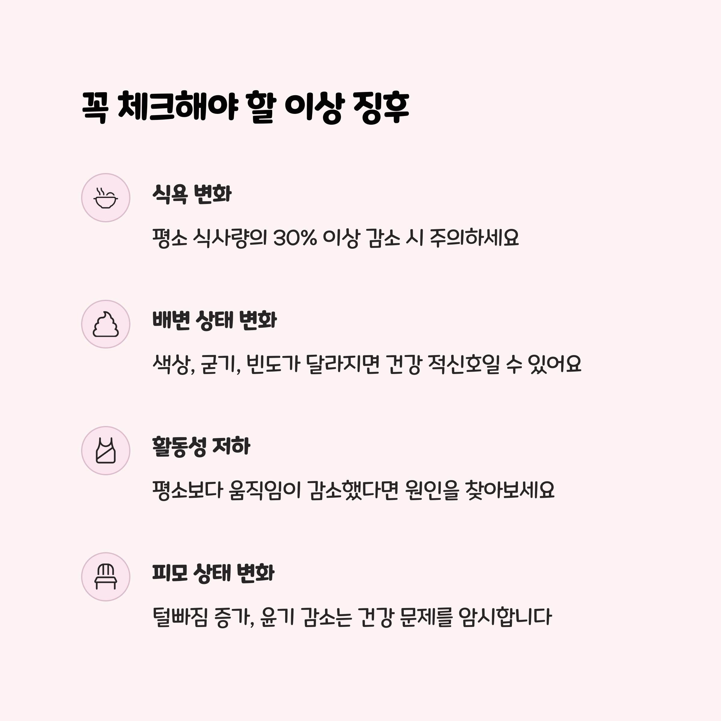 • 식욕 저하, 활동성 감소, 피부 발진, 구토/설사 등 평소와 다른 점을 발견하면 바로 병원 상담을 권장합니다.