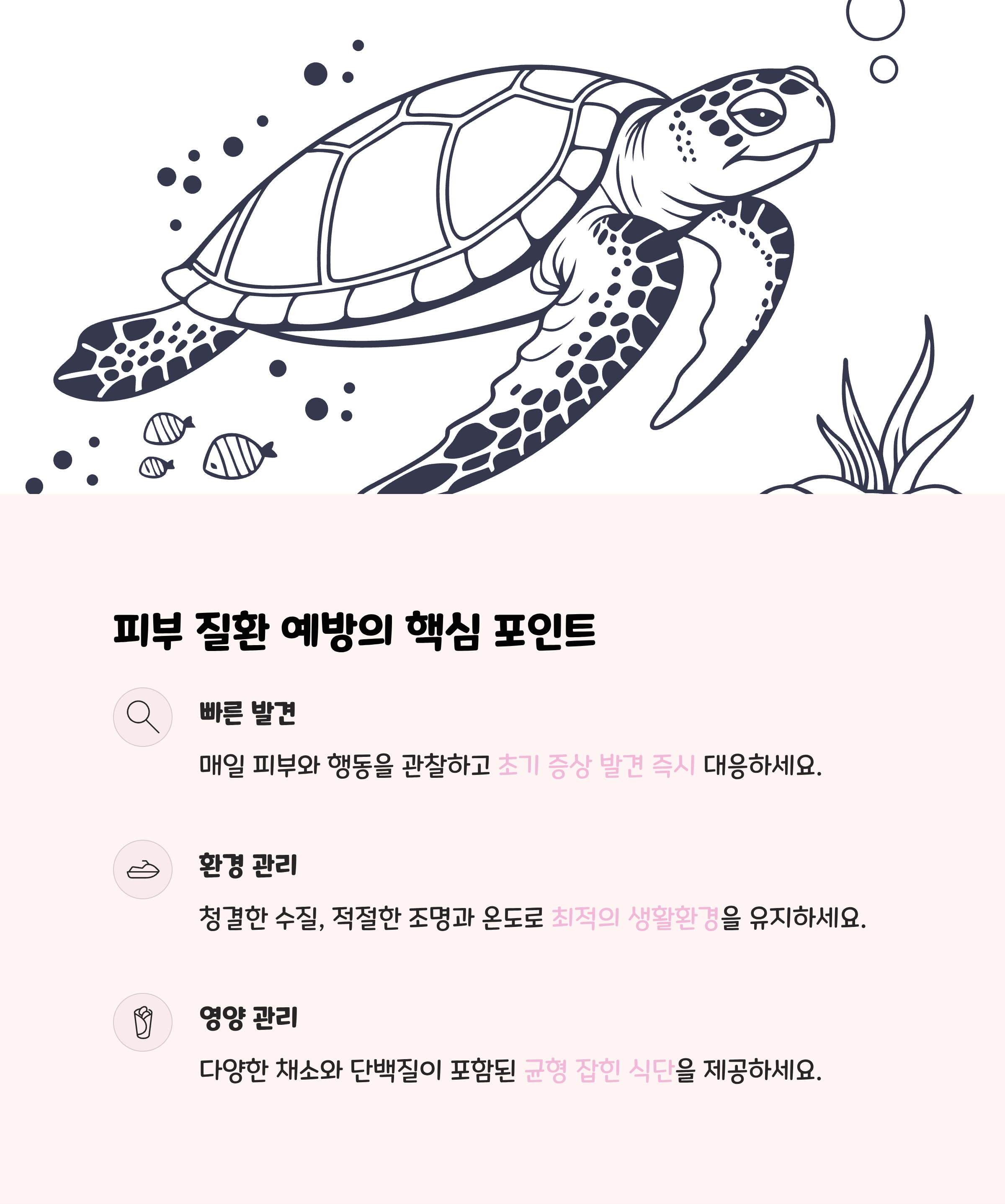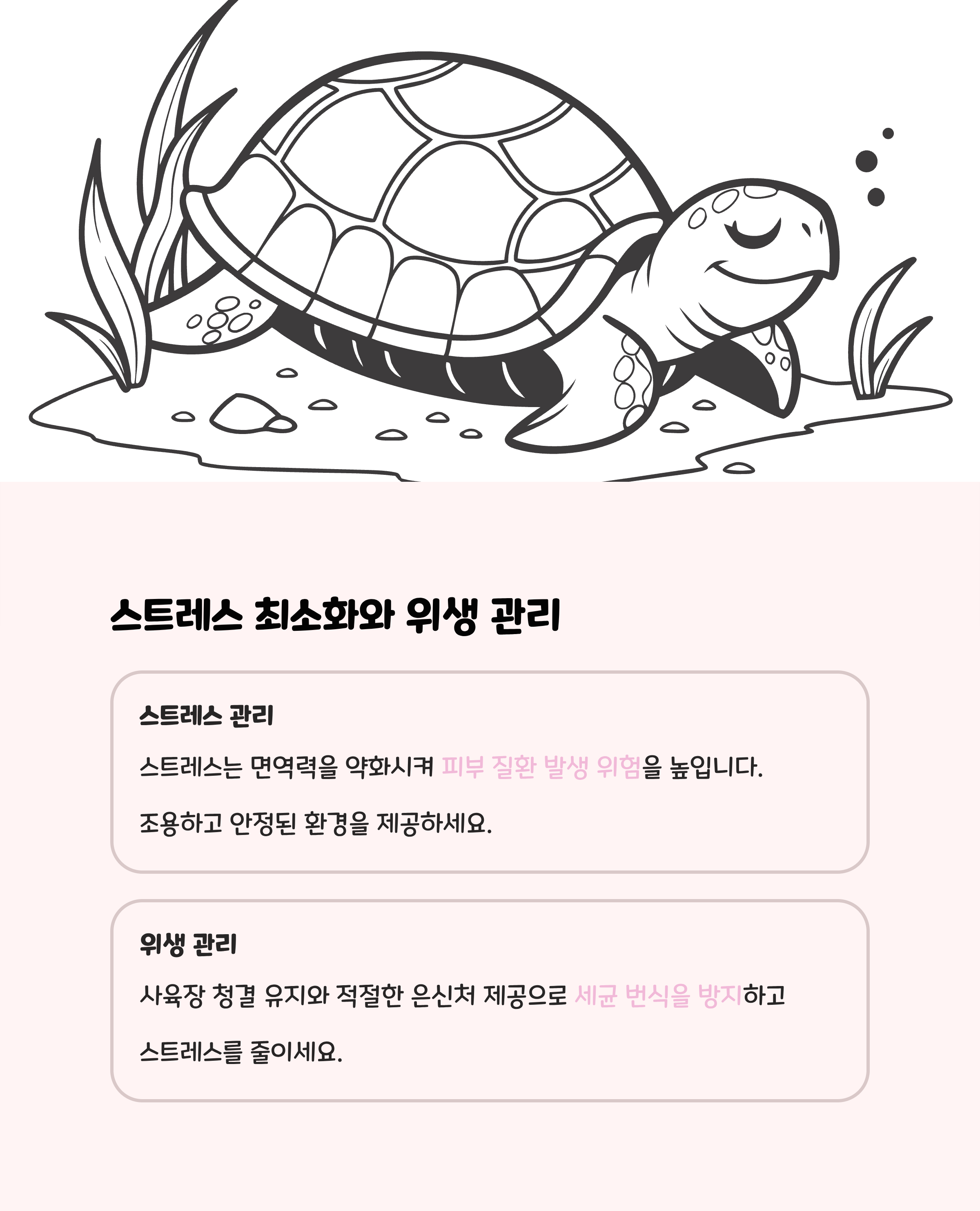 깨끗한 물이 거북이 피부병과 호흡기 감염 예방의 핵심이며, 수질 오염은 박테리아·곰팡이·기생충 번식을 촉진합니다.- UVB 자외선램프 설치 및 교체 주기 준수로 피부 건강과 면역력을 지원합니다.