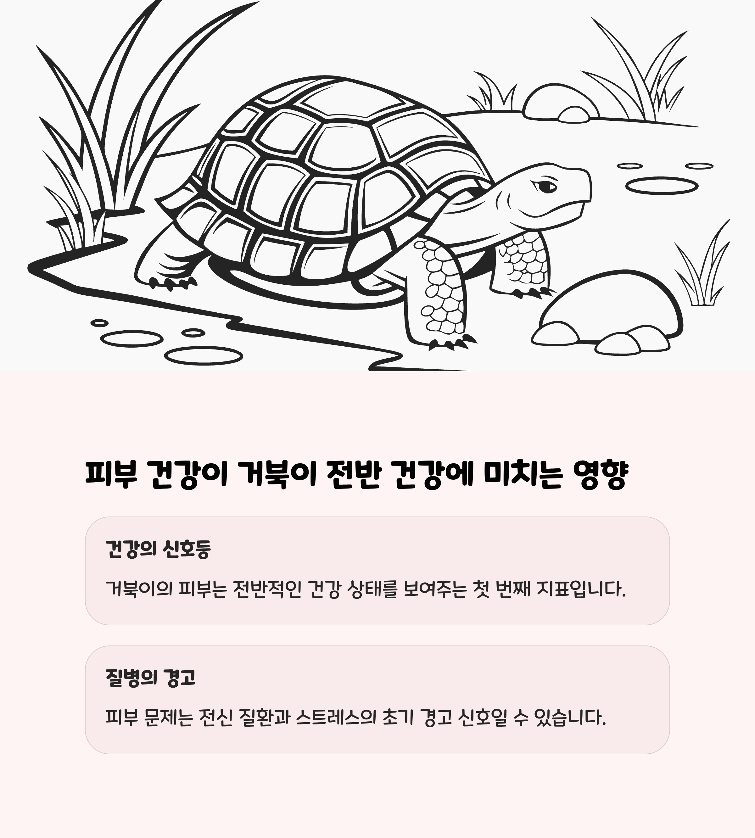 - 피부는 거북이의 주요 방어막으로, 손상 시 내부 감염으로 번질 위험이 높아집니다.