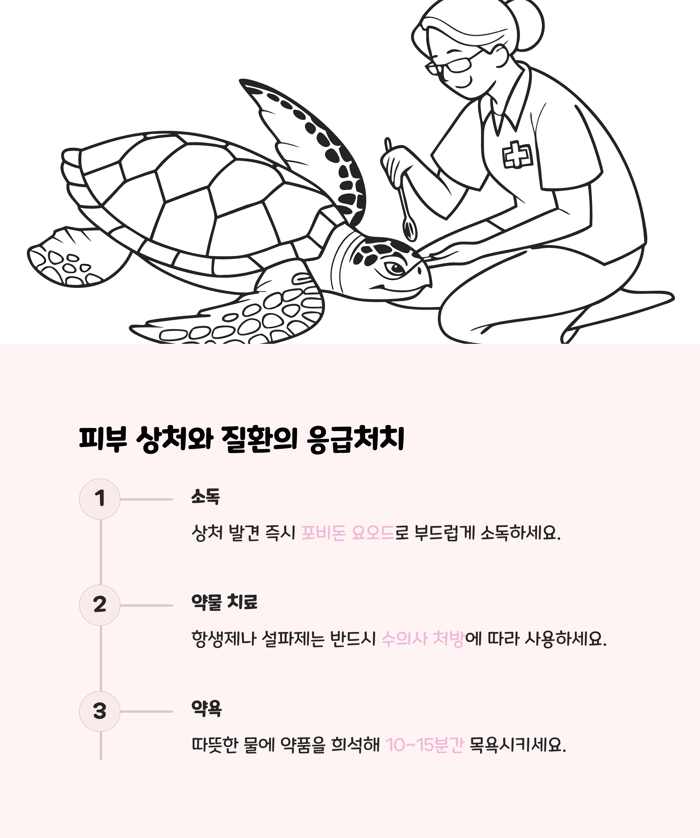 - 피부가 벗겨지거나 점막이 변색된 경우, 약욕을 통해 치료 보조 가능하며 28도 이상의 적정 수온 유지가 중요합니다.