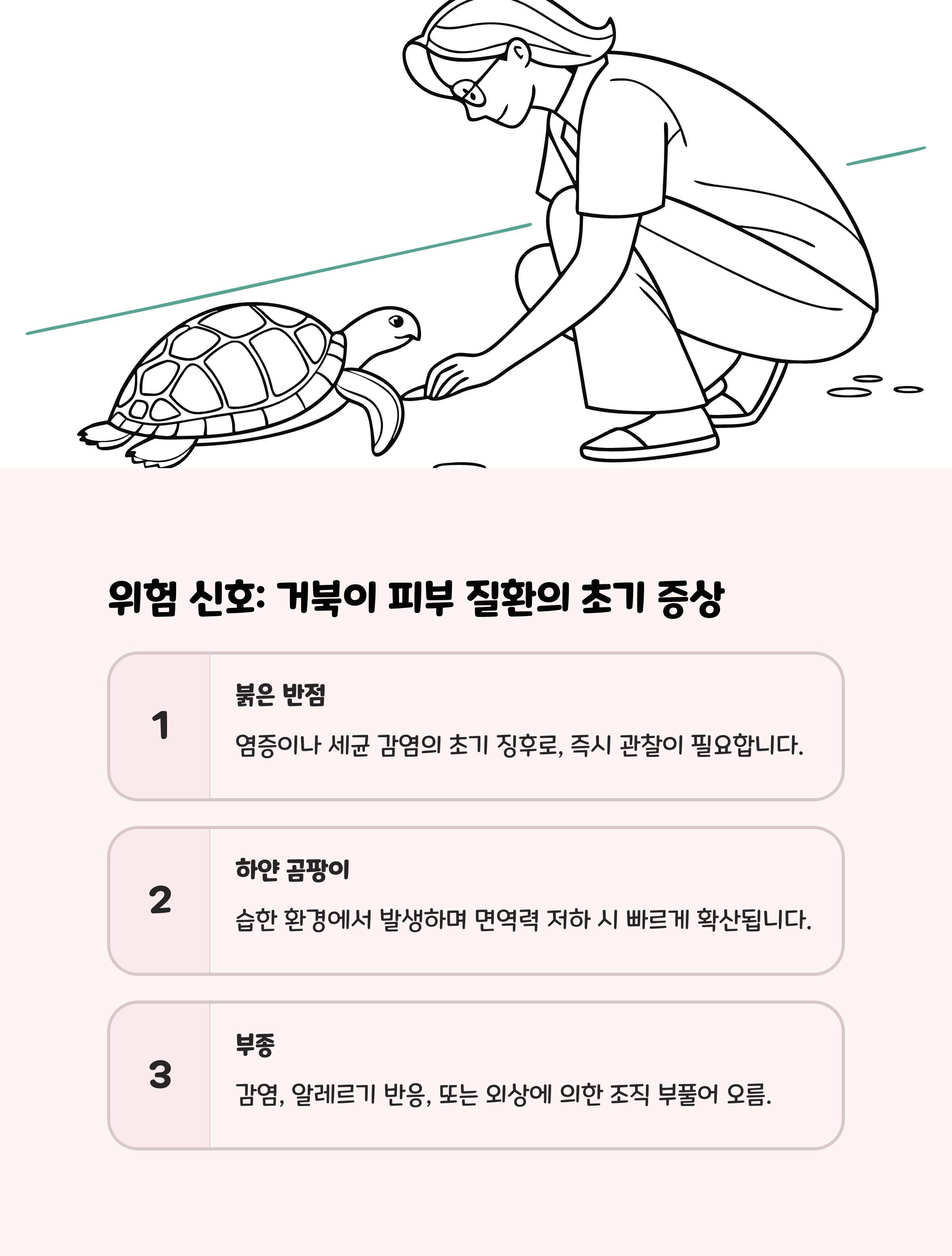 위 내용은 『쥬만지펫』 파충류 사육정보, Life info 티스토리의 거북이 피부병 원인 및 치료 방안, 그리고 여러 반려동물 건강 전문 블로그와 수의사 권고 자료를 참고하여 작성하였습니다.