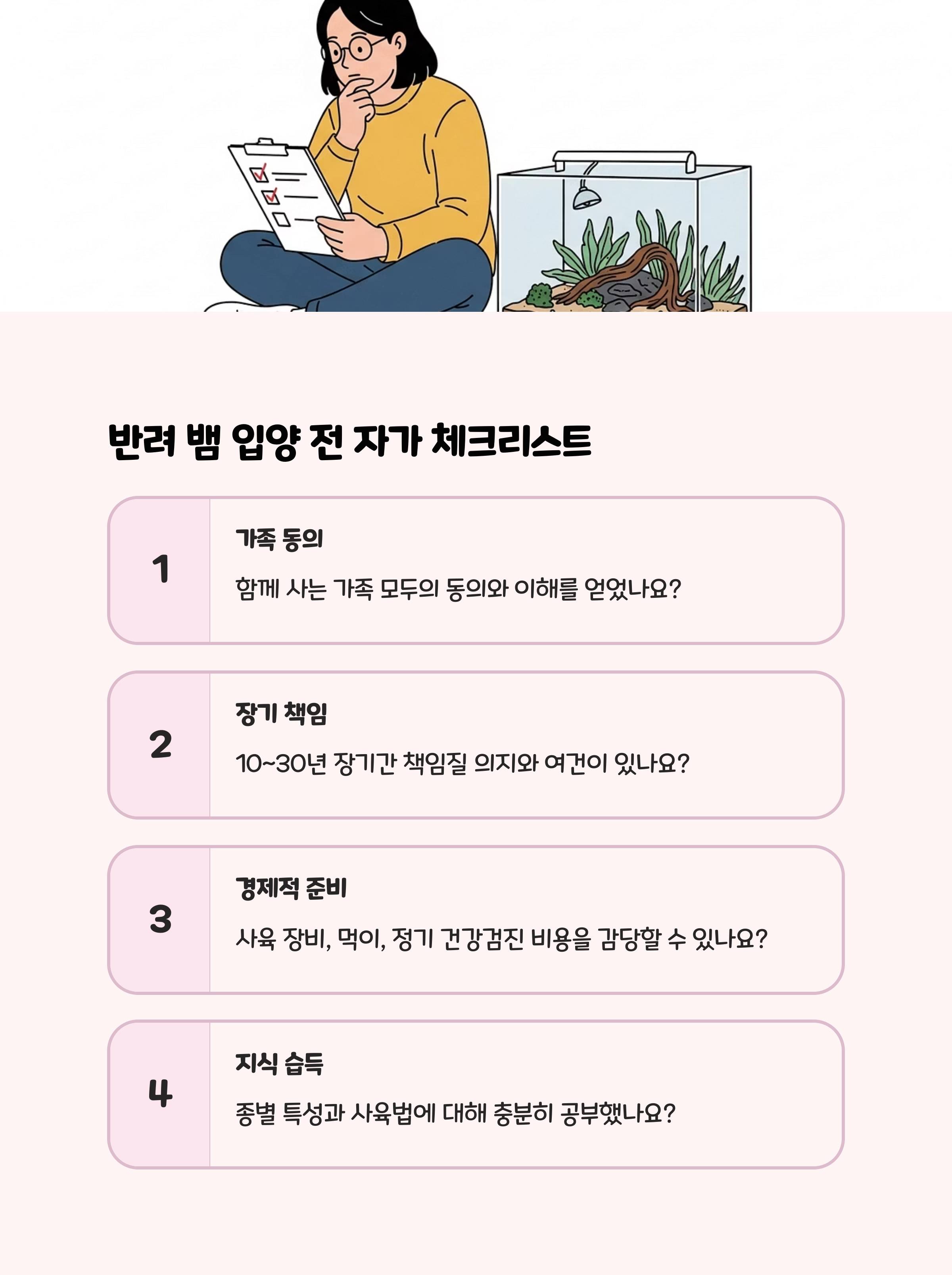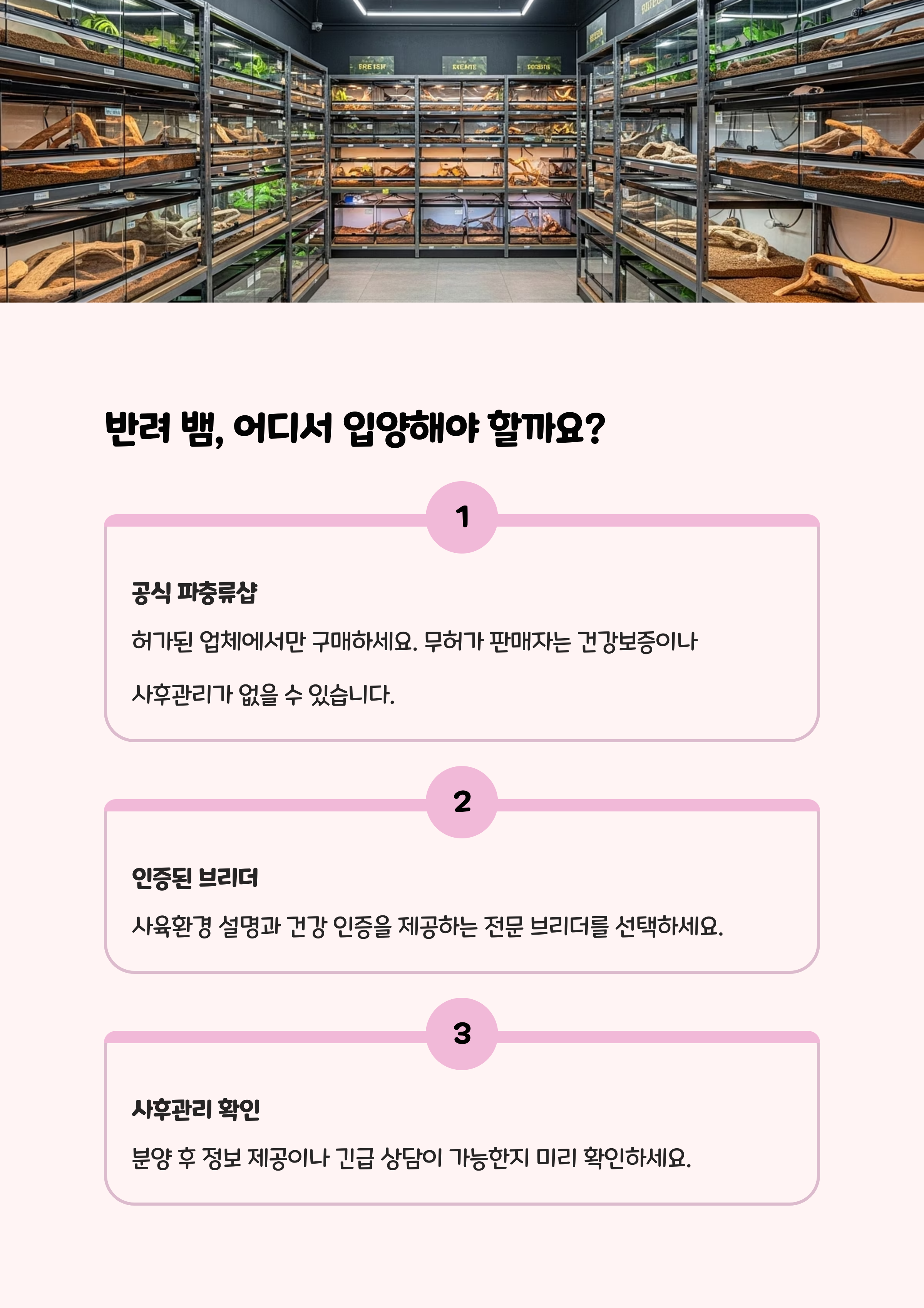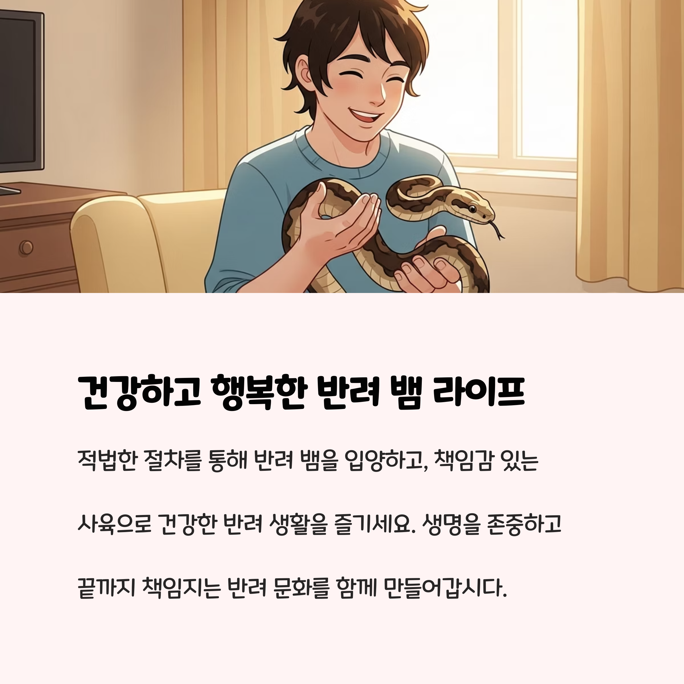 - 특정 뱀(예: 이국종, 맹독종) 입양 시 ‘반려동물 등록제’가 해당될 수 있으므로 반드시 판매자와 환경부 고시를 확인합니다.