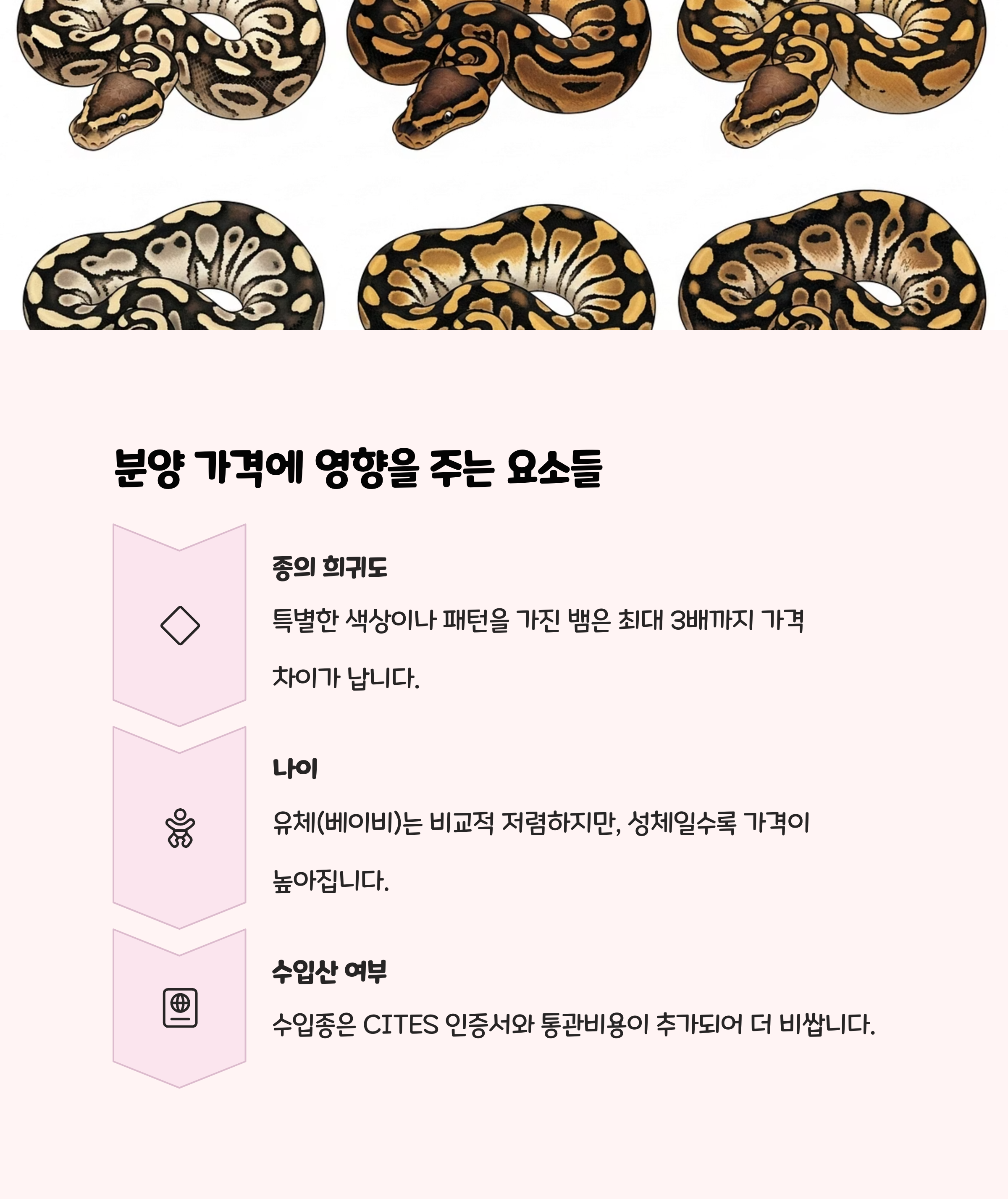 | 볼파이톤 | 100,000원~400,000원 | 온순함, 초보자 추천, 다양한 모프 존재 |