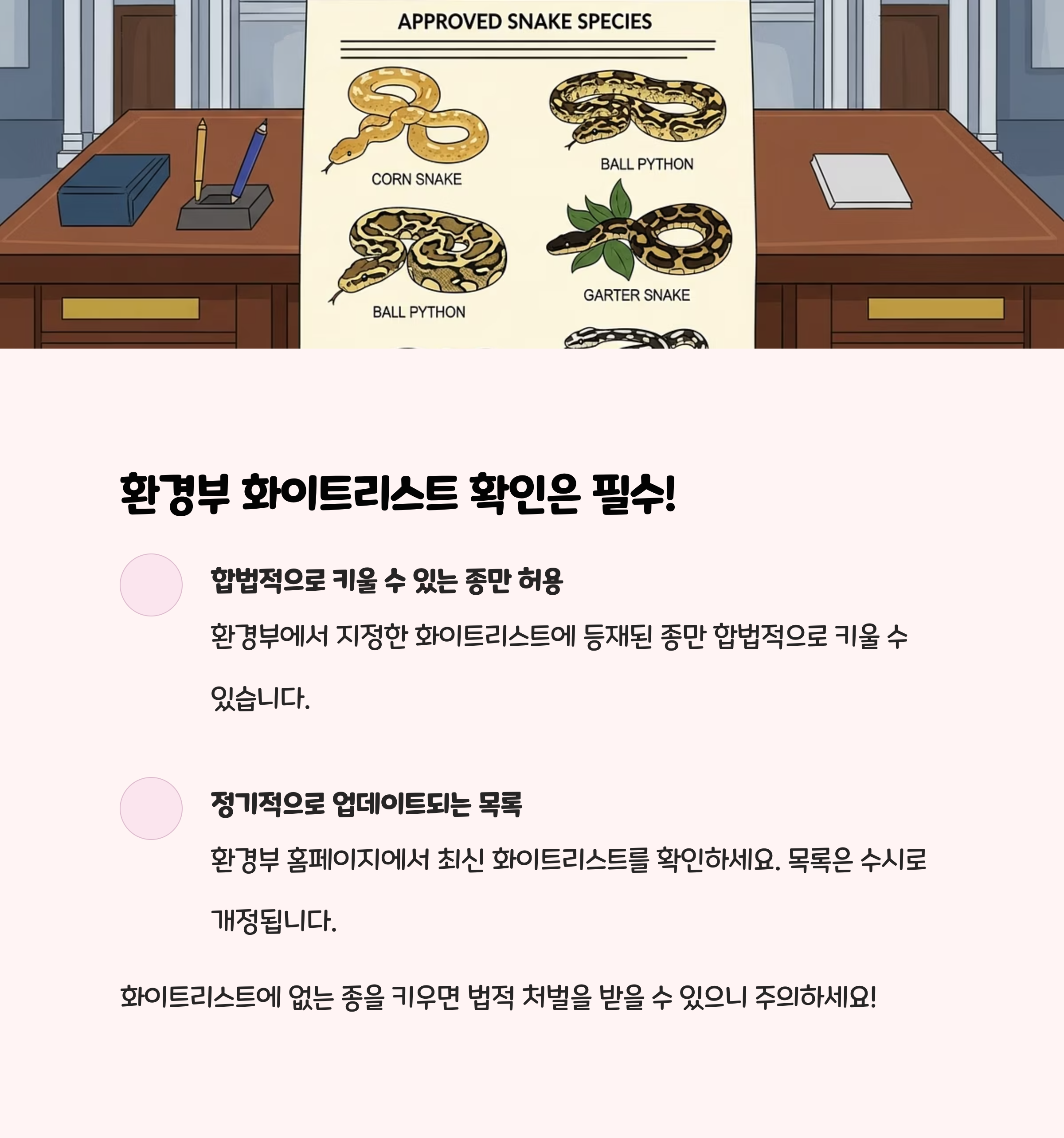 - 파충류는 환경부 지정 ‘화이트리스트’ 등록 종만 합법적으로 거래·사육이 가능합니다.