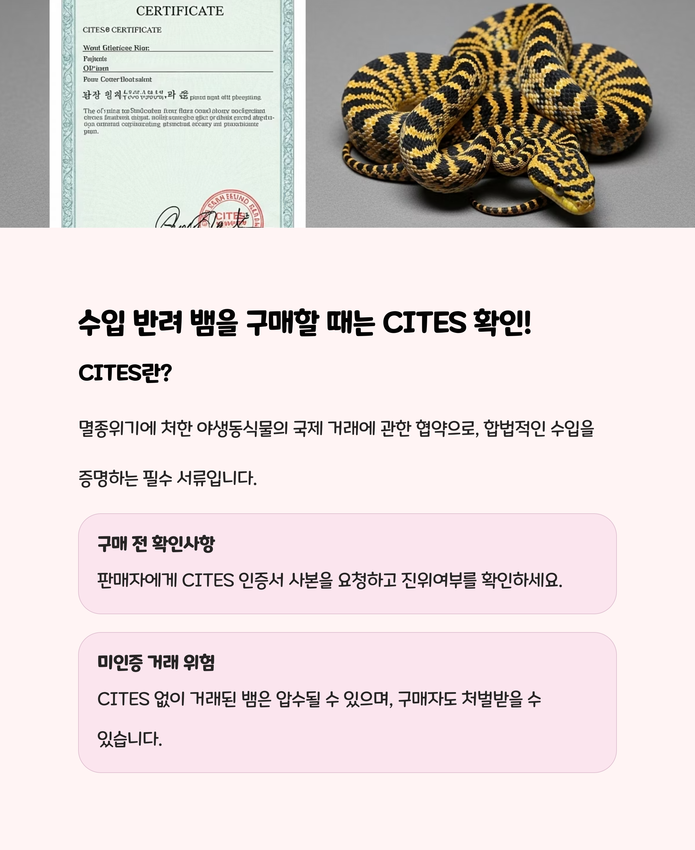 CITES 인증서는 멸종위기종 국제거래협약에 따른 공식 수입 증명서로, 수입종·희귀종의 경우 반드시 첨부되어야 합니다. 미제출 시 법적 처벌뿐 아니라 뱀 압수 조치가 따를 수 있습니다.