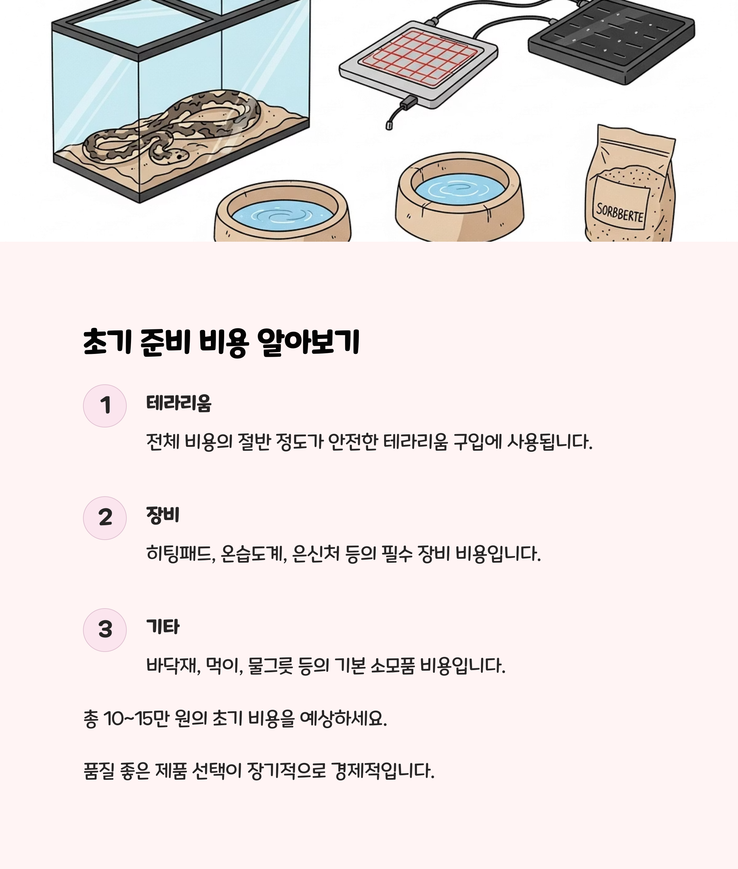 케이지, 바닥재, 온습도계, 히팅패드, 은신처 등 기본 세트 준비 시 약 10~15만 원, 이후 한 달 유지비(먹이, 바닥재, 소모품 등)는 평균 1~3만 원 내외로 산정됩니다. 입양 전 가족과 충분한 협의, 평판 좋은 동물샵 또는 보호소에서 입양하기, 정기적인 건강 검진, 반려동물의 장기적 동반을 위한 마인드가 필수입니다.