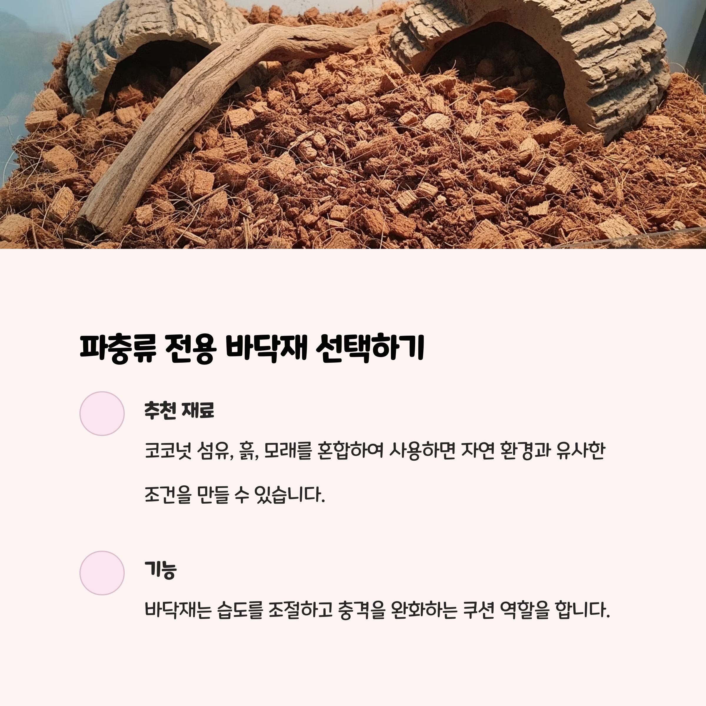 | 바닥재 | 코코넛칩, 아스펜베딩 등 파충류 전용 | 충분 |