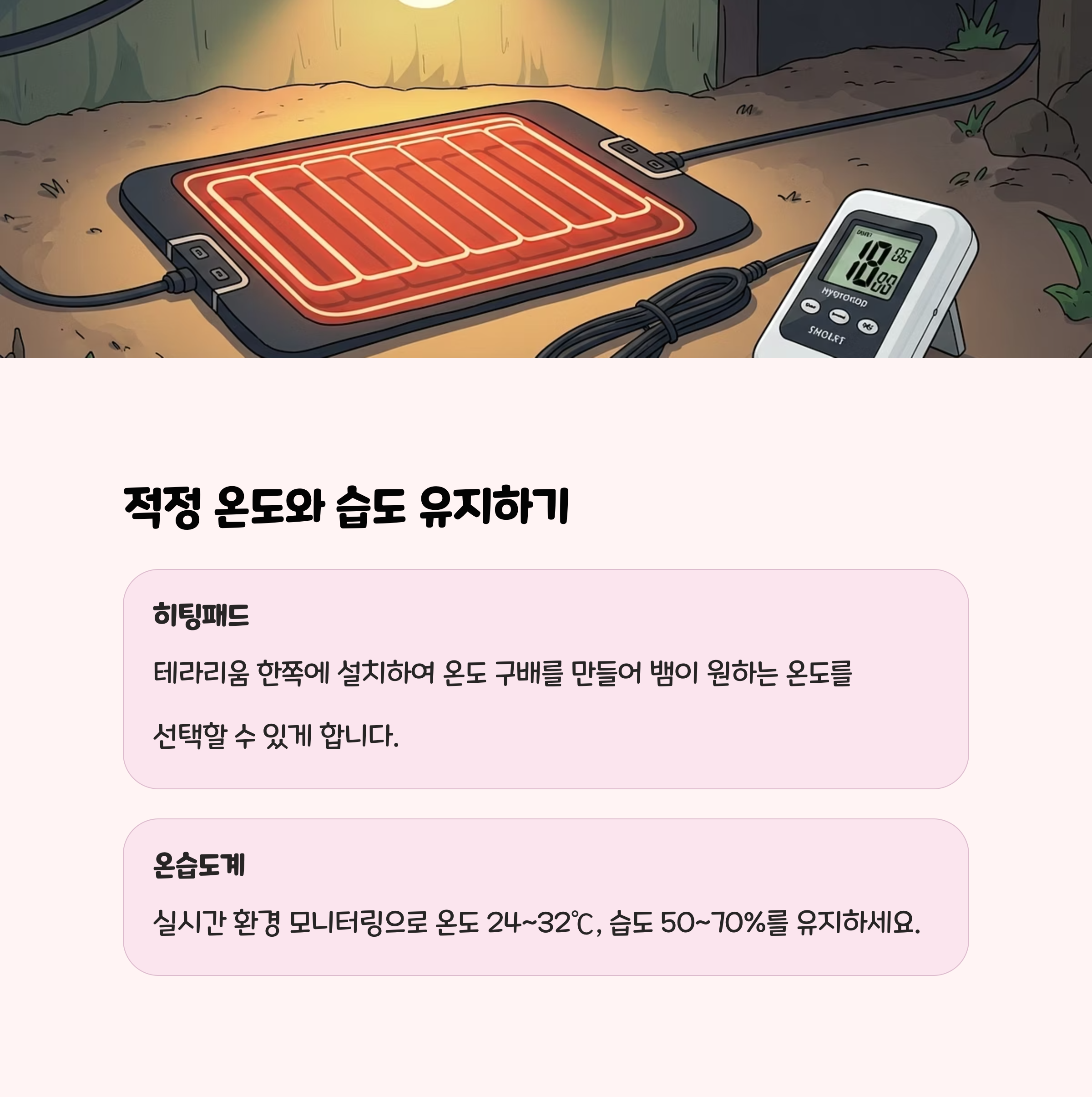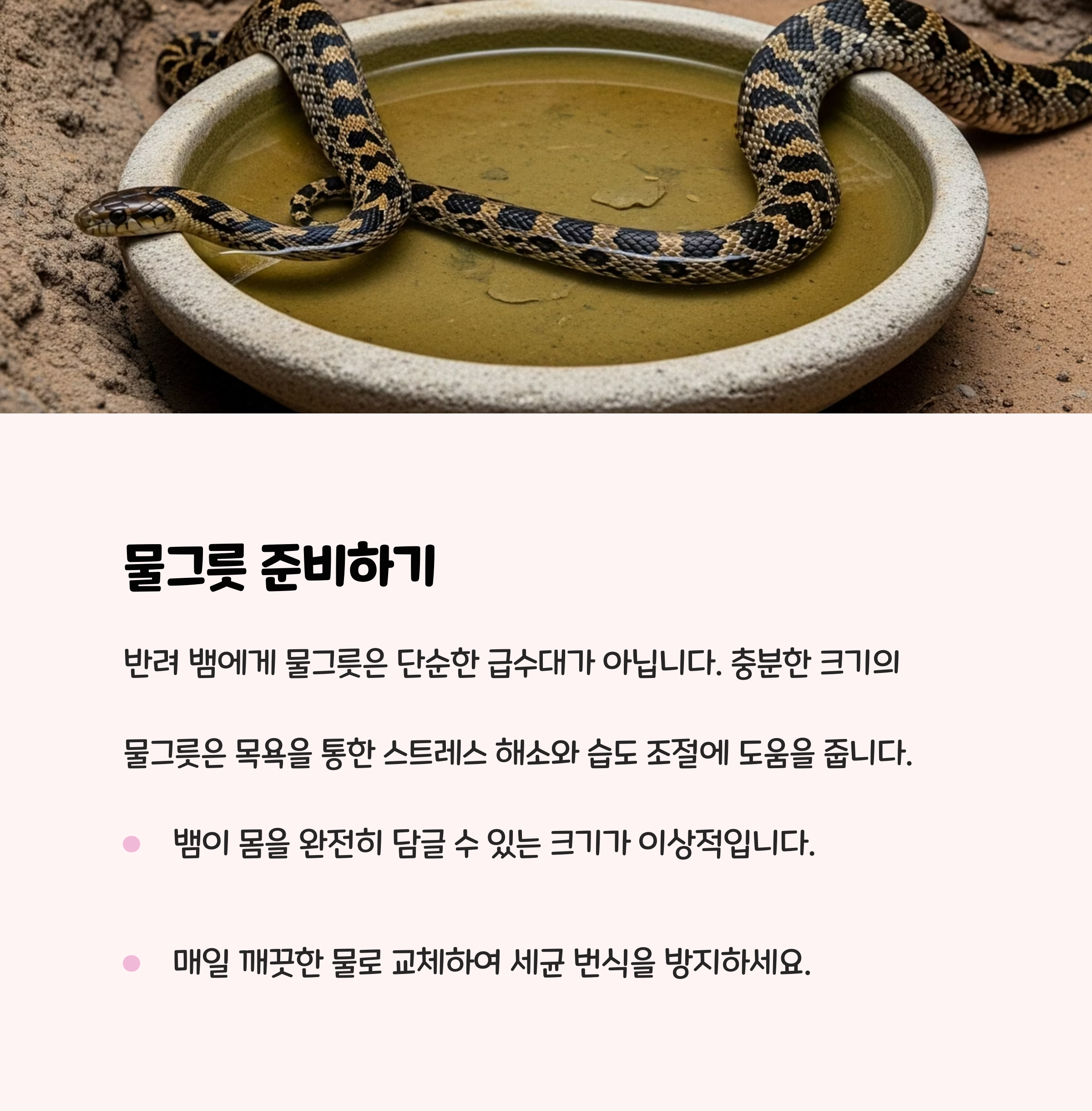 뱀은 공간을 탈출하기 쉬운 동물입니다. 40cm × 25cm 이상의 유리 또는 플라스틱 테라리움이 권장되며, 환기가 잘 되고 뚜껑이 확실히 잠기는 케이지를 선택해야 합니다. 베이비 뱀은 더욱 작은 틈도 통해 빠져나갈 수 있어 크기에 꼭 맞는 제품을 준비하세요.
