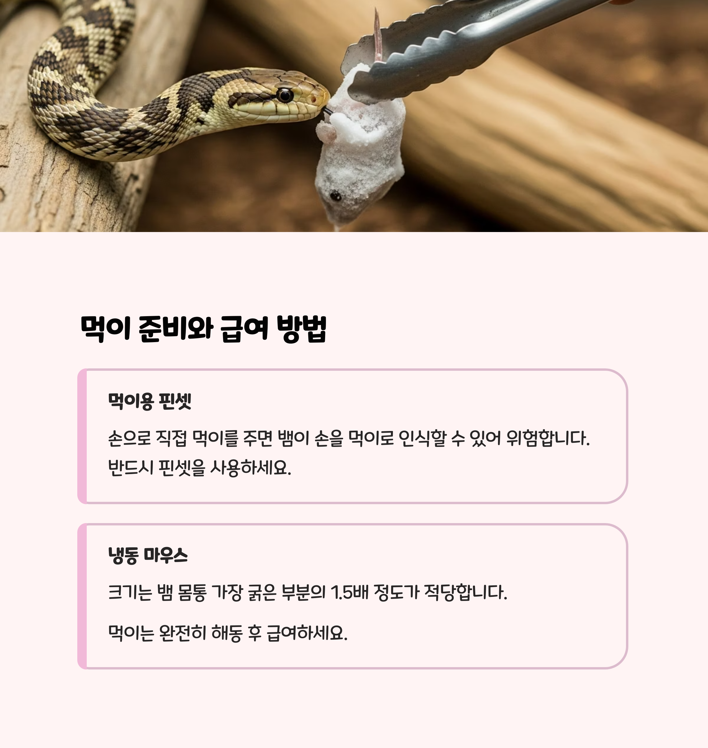 - 냉동 먹이는 철저 해동 후 급여 먹이의 크기는 뱀 몸통 두께와 비슷해야 하며, 너무 큰 먹이 급여는 소화불량을 유발할 수 있습니다.