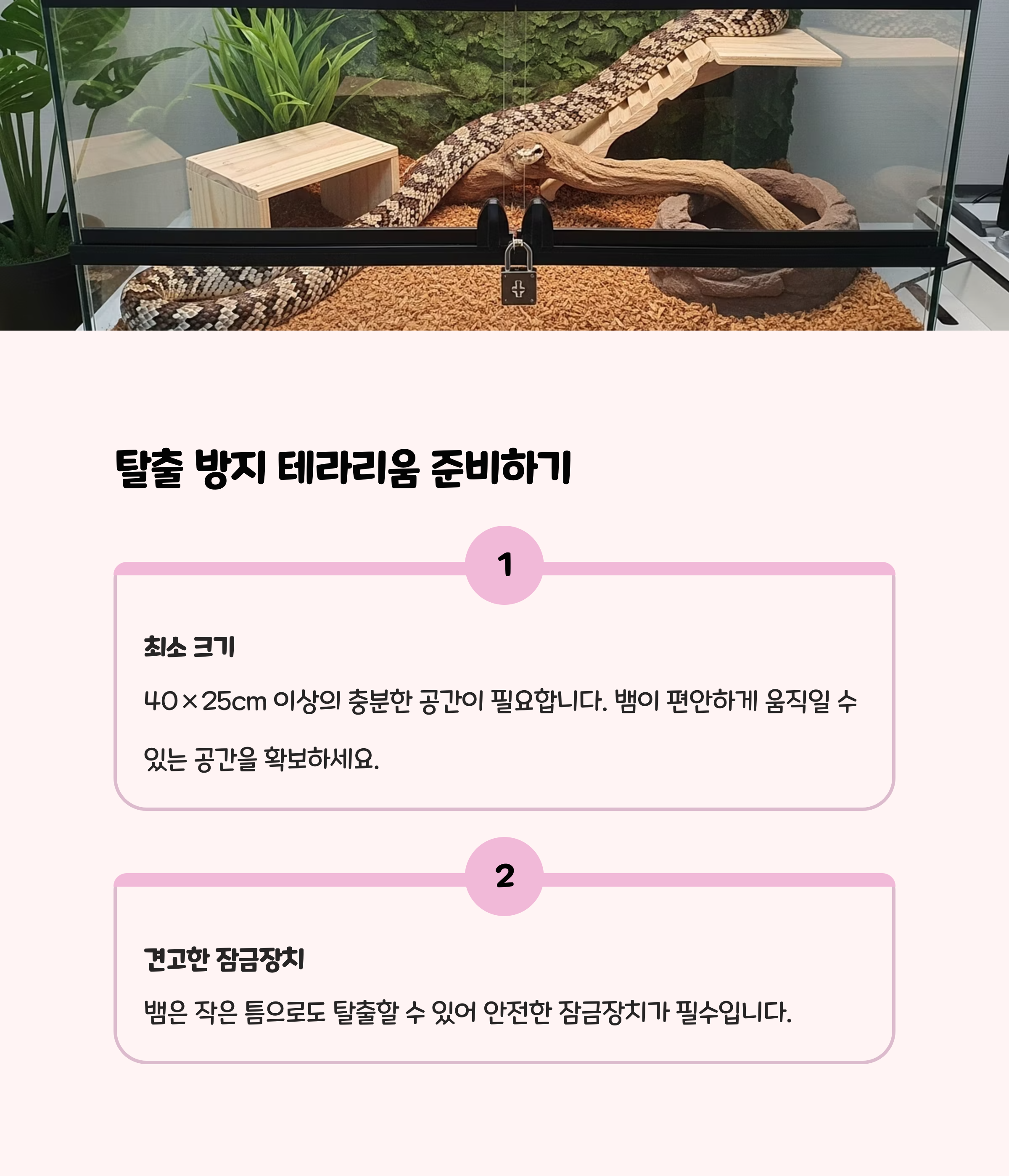 뱀은 공간을 탈출하기 쉬운 동물입니다. 40cm × 25cm 이상의 유리 또는 플라스틱 테라리움이 권장되며, 환기가 잘 되고 뚜껑이 확실히 잠기는 케이지를 선택해야 합니다. 베이비 뱀은 더욱 작은 틈도 통해 빠져나갈 수 있어 크기에 꼭 맞는 제품을 준비하세요.