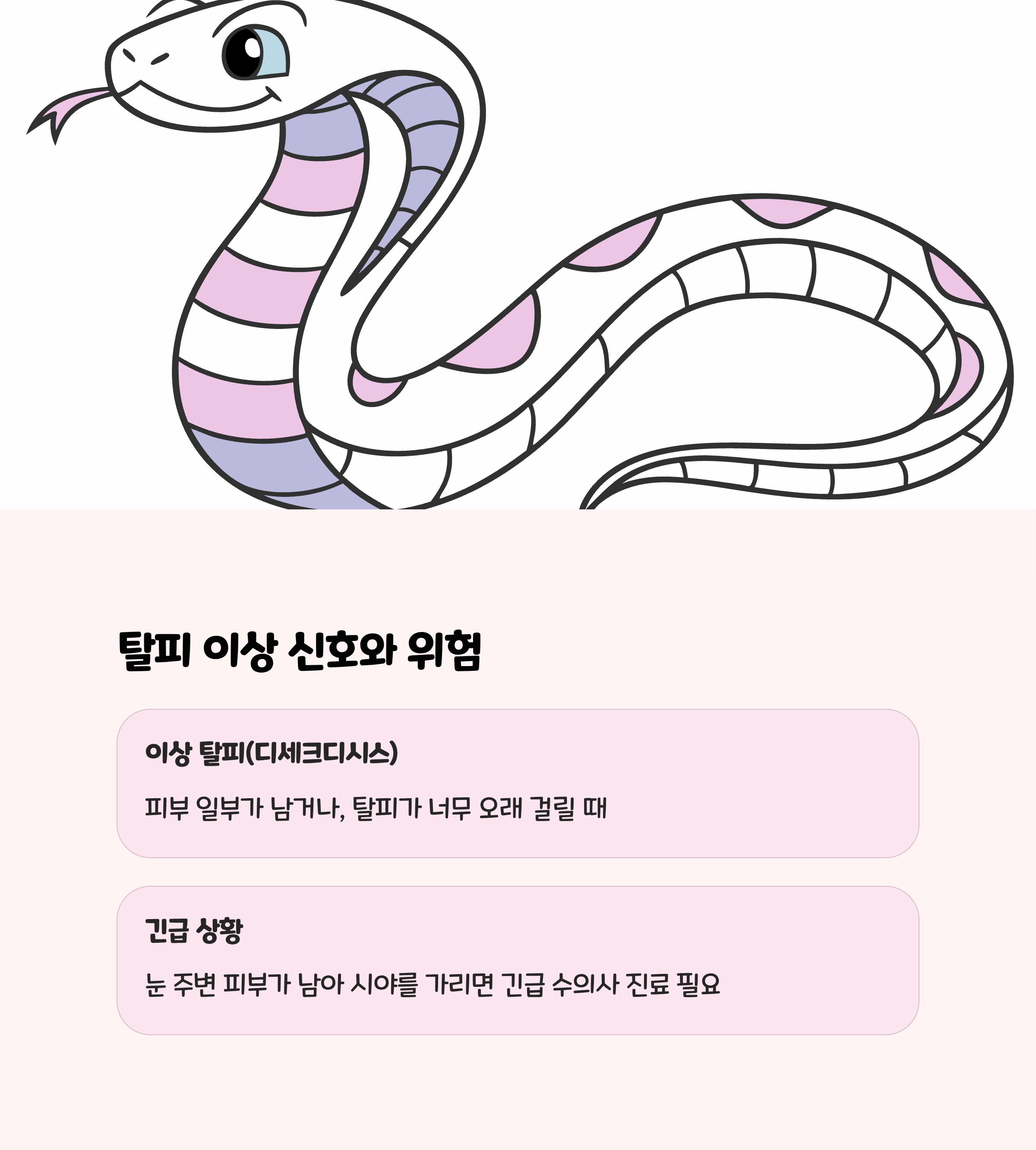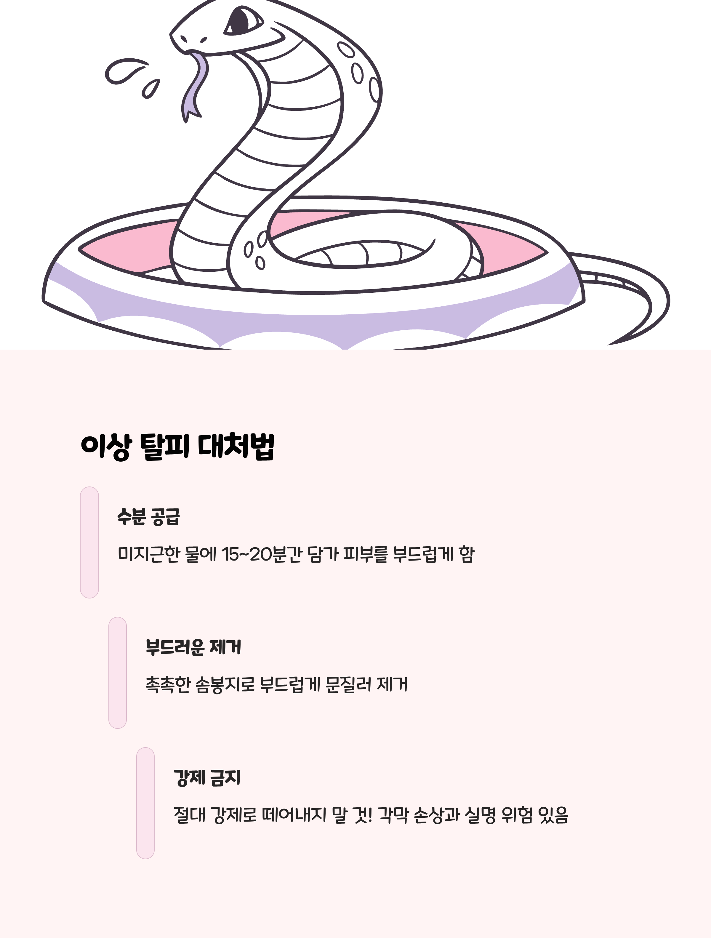 | 피부가 완벽히 벗겨지지 않고 남아 있을 때 | 물에 불린 후 부드럽게 제거, 개선 없으면 즉시 수의사 방문 |